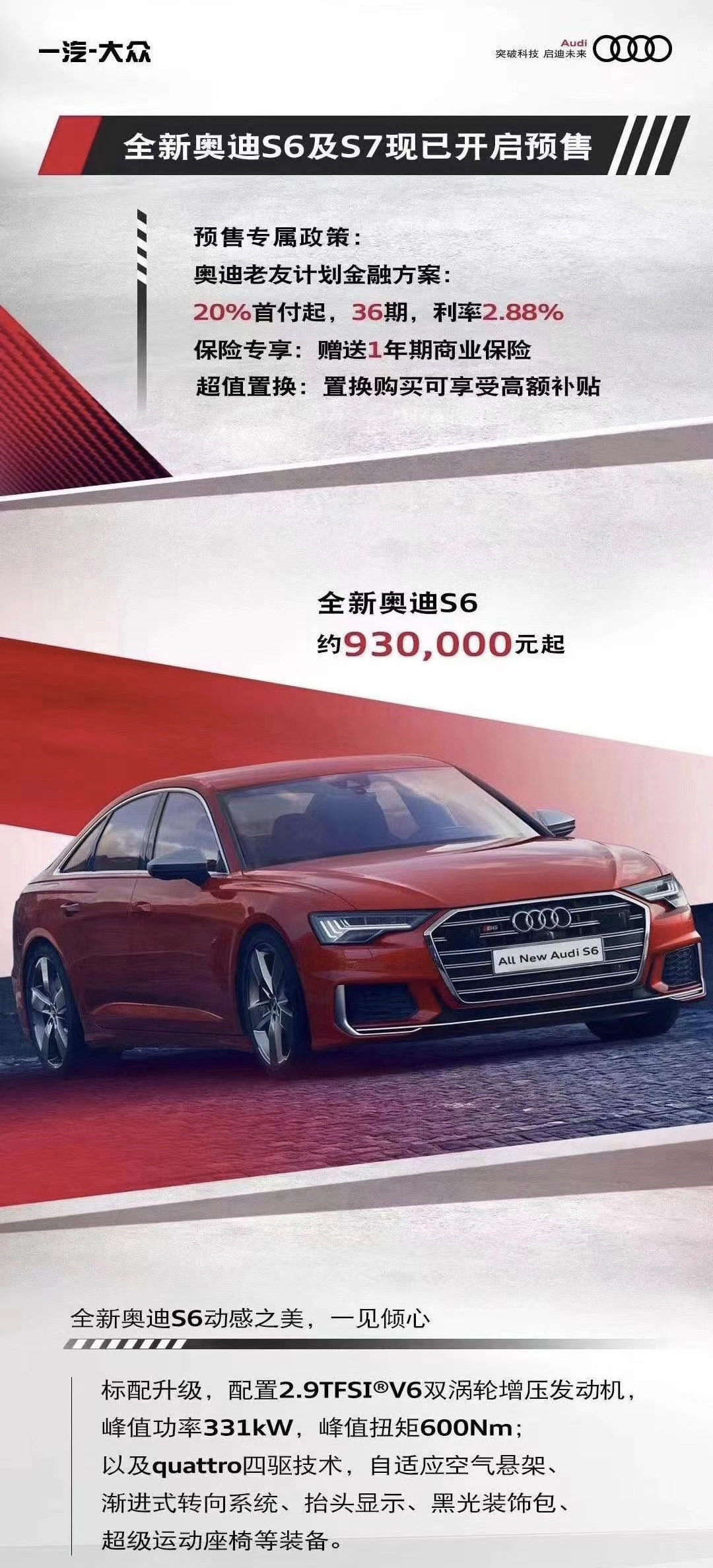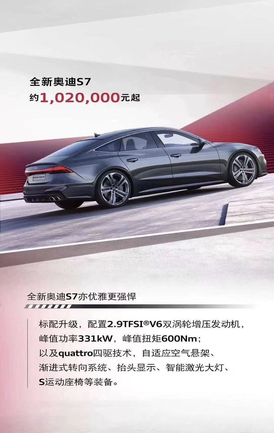 S6和S7搭载2.9TFSI双涡轮增压V6汽油机,搭配48V轻混系统,最大马力450匹,峰值扭矩600牛·米,匹配8AT和全时四驱。