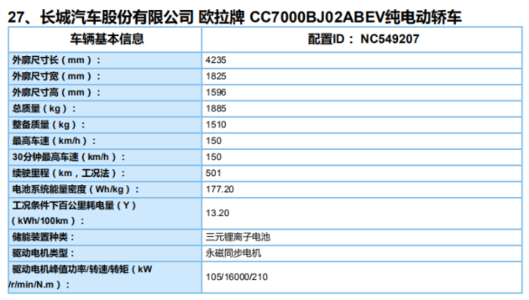 近日,我们从工信部了解到,全新欧拉好猫搭载了永磁同步电动机,最大功率105kW,使用三元锂离子电池。从参数图中可以看到,其续航里程达到501km,最高车速能够去到150km/h,这样的数据表现,对于该级别车型而言,可以说是相当出色。另外,欧拉白猫在外观部分采用了复古的造型设计,大量的弧线设计,整台车看起来相当的圆润、可爱。尾部设计也是相当特别,尾灯位置并没有放在常规的位置,以至于你看上去,它像是没有尾灯一样。在尺寸上,其长宽高分别为4235*1825*1586mm,轴距2550mm,由于其采用了前后悬偏短的设定,因此,轴距会偏长。总的来说,用于日常代步,好猫还是相当不错的。