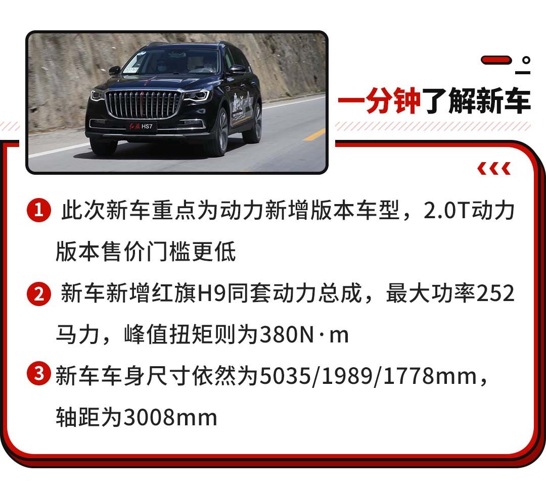 前一段时间,随着国之旗舰车型--红旗H9的上市,一下把红旗的热度推到高潮。趁热打铁,红旗HS7在原来的基础上新增一款2.0T动力版本,降低购买门槛,将亲民化进行到底。