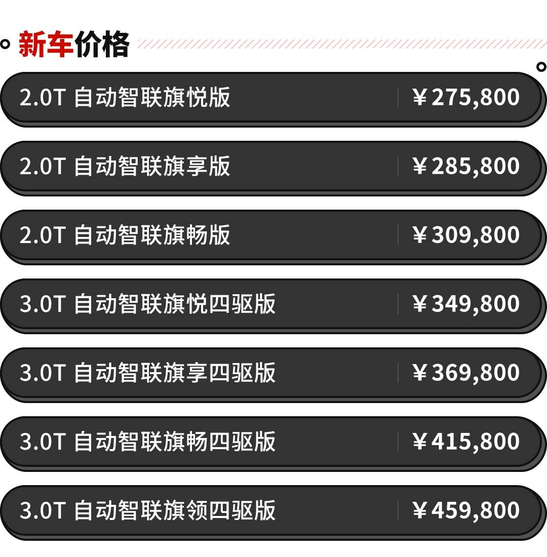 售价为27.58万的智联旗悦版,作为入门版但配置相对比较齐全。被动安全比较丰富,即使是入门版的配置车型,也比3.0T的顶配车型只少了后排侧气囊。而在基础舒适性配置上,有着定速巡航、一键启动、倒车影像、全景天窗、电动后备箱带记忆等配置,能够满足大部分消费者的日常使用需求。