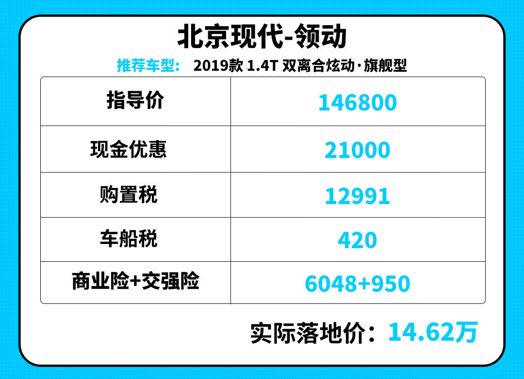 以领动1.4T旗舰型为例,车辆指导价为14.68万,优惠2.1万后裸车价为12.58万,算上购置税、交强险等各类费用后,车辆实际落地价为14.62万,基本处于与指导价持平的情况,而且考虑到优惠还能进一步洽谈,实际落地价应该还能再低一些。