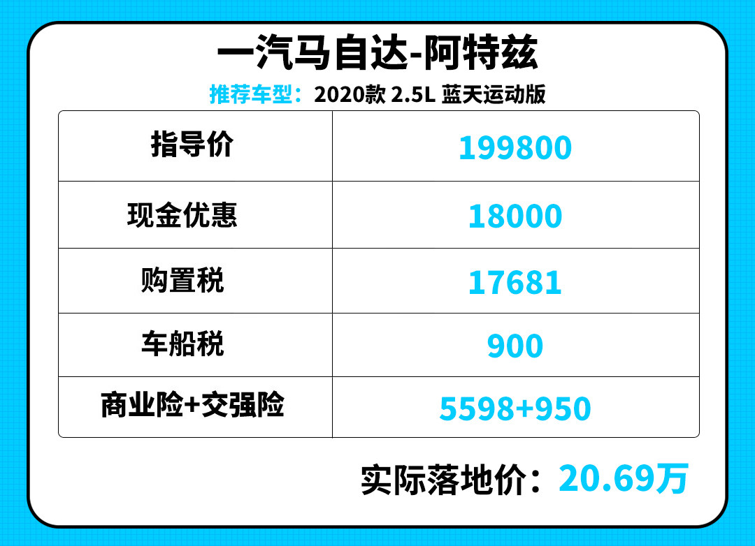看回购车方面,目前阿特兹全系有着1.8万的现金优惠,以2.5L蓝天运动版为例,优惠后车辆的裸车价为18.18万。加上税费和保险费用车辆落地价位20.69万,相较19.98万的官方定价仅高出0.71万。而且值得一提的是马自达在国内大多数地区的优惠都十分统一,目前大部分地区均有1.8万的现金优惠。