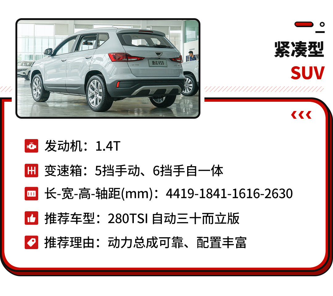 当然捷达VS5也不必买到高配或者顶配,前段时间更新的中配2020款280TSI 自动三十而立版(9.88万)就完全够用,增加了很多高配车型都没有的配置,像360度全景影像、电动尾门、远程启动等,还送保养。所以这款车低配高配都值得买,高配的体验更好更值得买。