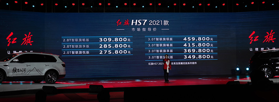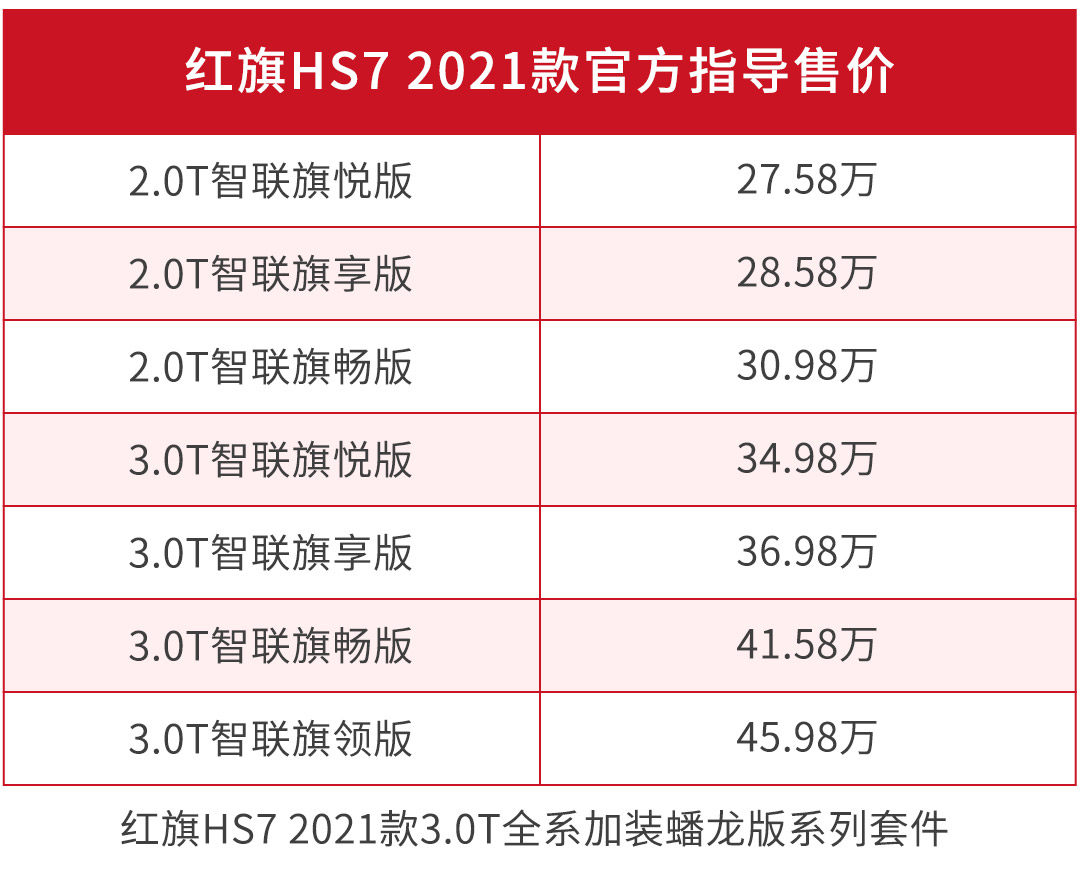 北京时间8月29日晚,红旗HS7 2021款正式上市,共计7款车型,官方指导价27.58-45.98万元。