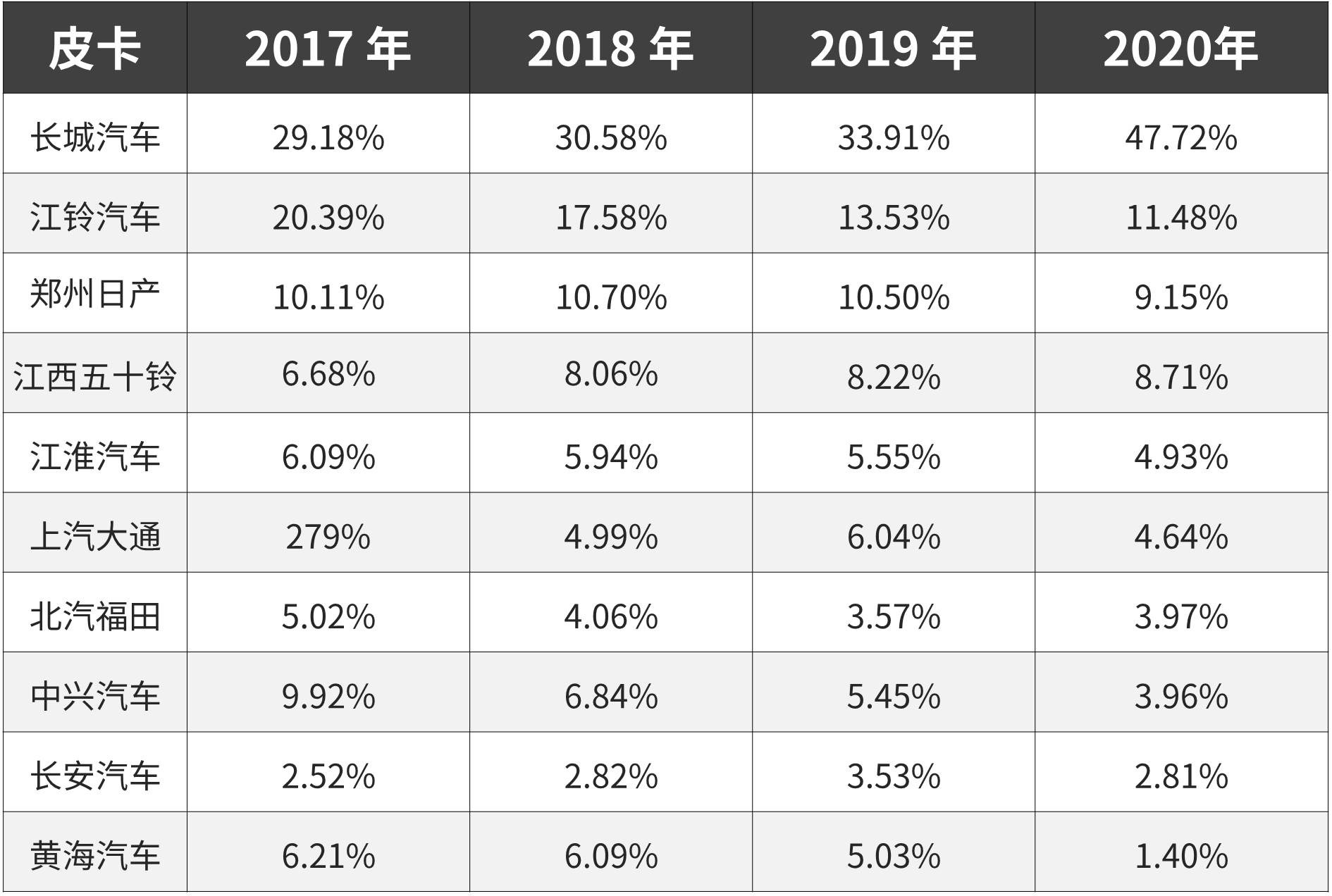 从车企的市场份额来看,从2017年至今,长城汽车在皮卡的市场份额在不断提高,从2017年的29.18%提升到了2020年的47.72%。而与之成反比的则是,其他车企在竞争当中不断被抢占的市场份额。