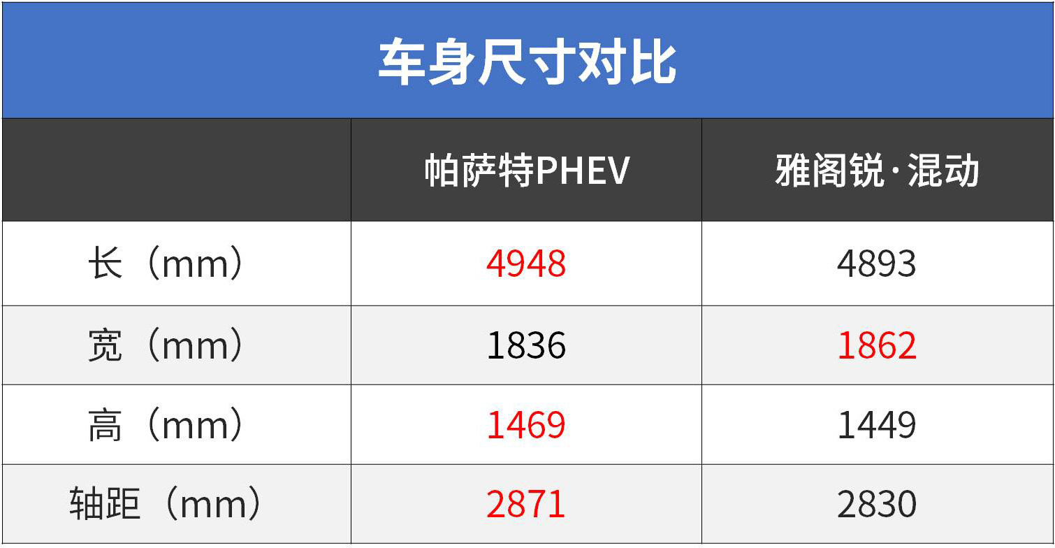 虽然两者在级别上同属B级家轿,但帕萨特PHEV车身尺寸上却更具优势,其长宽高为4948/1836/1469mm,轴距为2871mm。而反观雅阁锐•混动,其长宽高为4893/1862/1449mm,轴距为2830mm。
