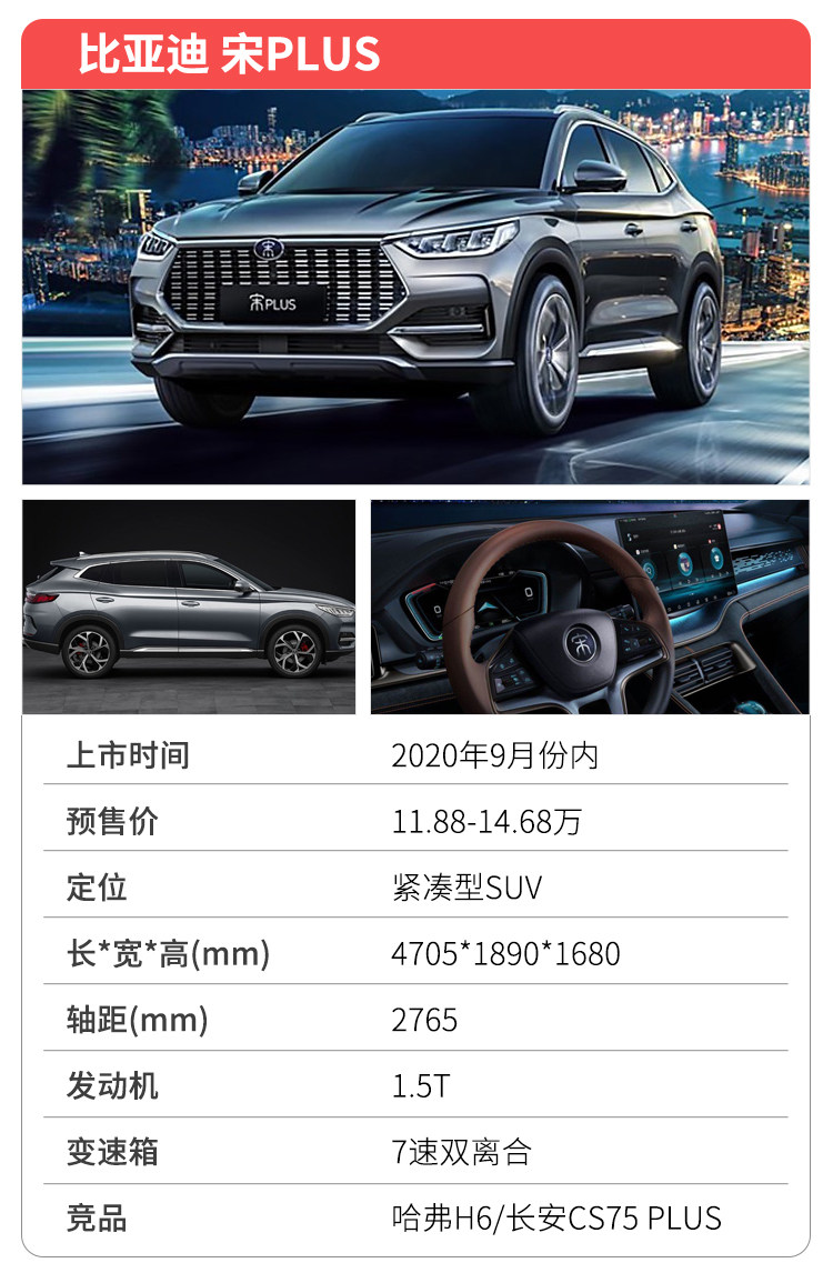 新车定位紧凑型SUV,但有着中型SUV般的表现,车身尺寸达到了4705*1890*1680mm,轴距则是2765mm,加上5座座椅布局,更像是比亚迪唐“mini“,而预售价只不过是11.88万起,对一众对手来了一次”降维打击“。宋PLUS采用了最新的Dragon 3.0设计语言,尾部还颇有一种轿跑SUV的感觉,外观来看来颇为吸引。内饰则是向汉看齐,整体典雅同时还带有科技感,动力方面则搭载全新1.5T高功率发动机,最大功率达到了185马力,匹配全新7速双离合变速箱。就如此表现来看,这会是比亚迪2020年最值得购买的SUV产品。