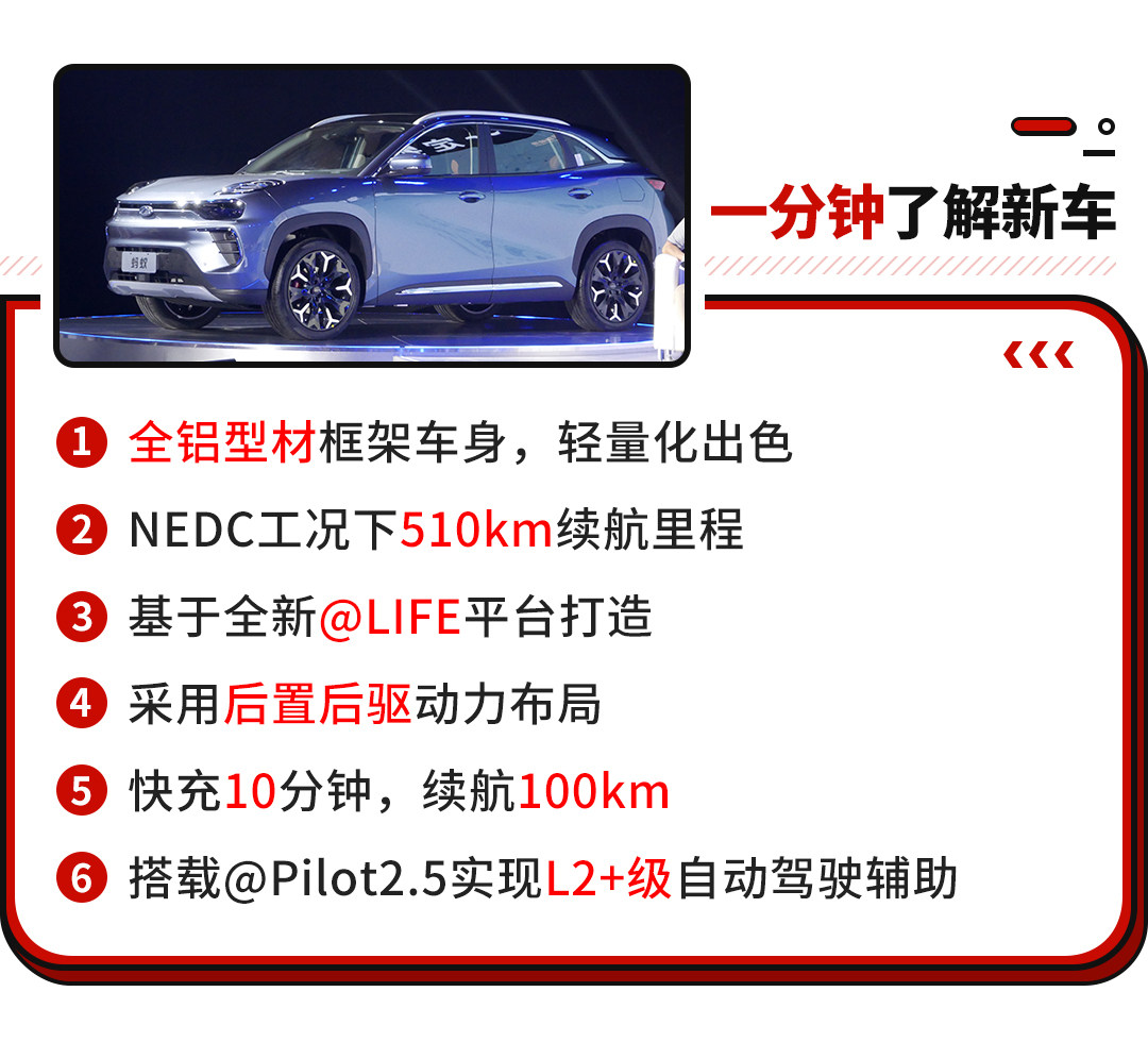 2020年8月28日,基于奇瑞全新@LIFE全铝纯电动平台打造而来的纯电动中型SUV——奇瑞蚂蚁,正式开启预售,预售价格为16-17万元,共推出两款车型,NEDC工况下续航里程均为510km。另外,现场还同步公布了奇瑞新能源@LIFE平台。