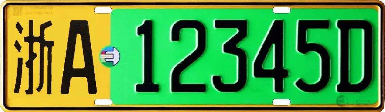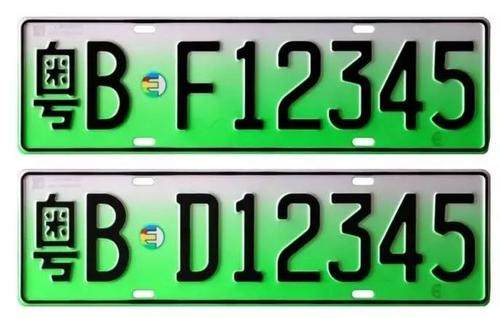 黄&绿底黑字+黑色外框,最后一位字母“D”代表纯电动汽车,“F”代表非纯电动汽车号牌。
