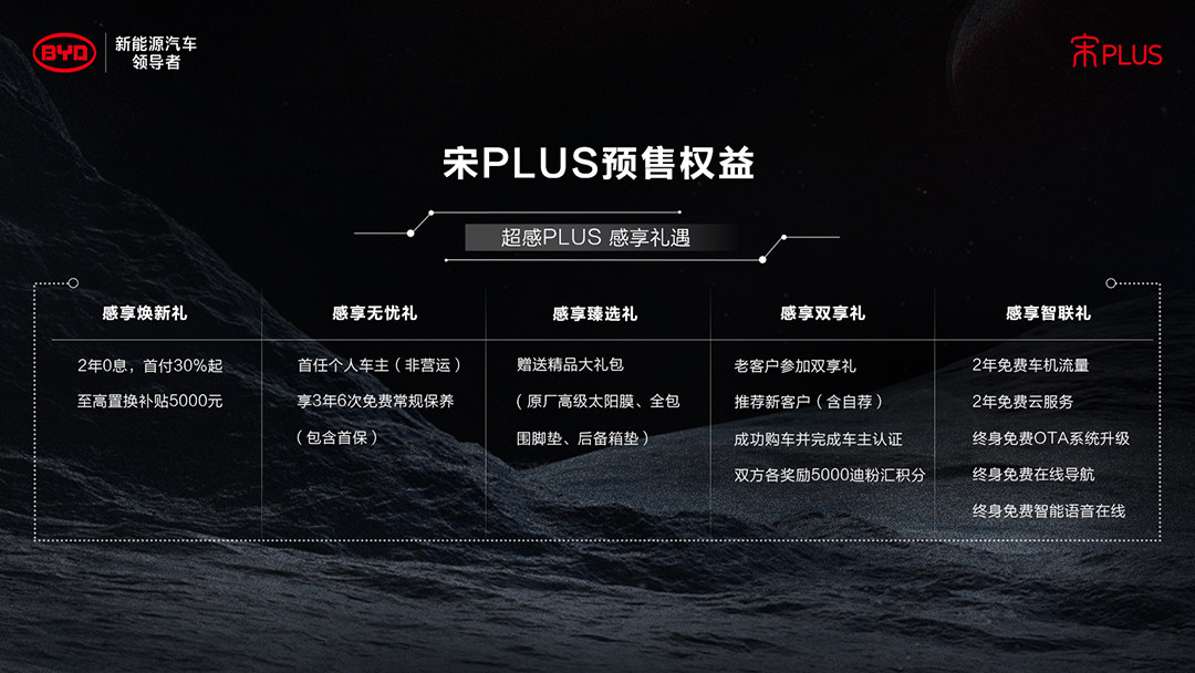 即将于九月上市的宋PLUS,是比亚迪继汉之后于今年推出的第二款重磅车型。作为一款B级SUV车型,TA填补了宋Pro与唐之间的车型空白,凭借其越级品质直击中高端SUV市场。新车以充满高级感的全新设计,更具质感的越级驾乘体验,满足了消费者更加多元化的用车升级需求。而11.88万元-14.68万元的预售价格,将成为15万级SUV价值首选。即日起到比亚迪各销售服务店预订,即可享受“2年0息,首付30%起、至高置换补贴5000元”等感享五重好礼。抢先扫码二维码,惊喜多多不容错过。