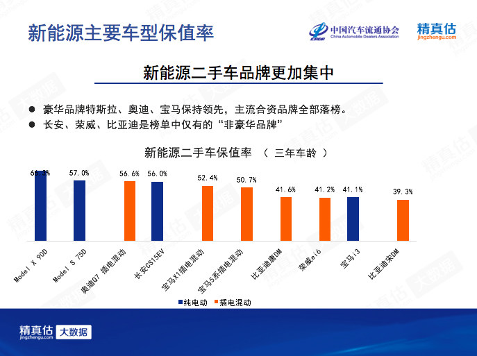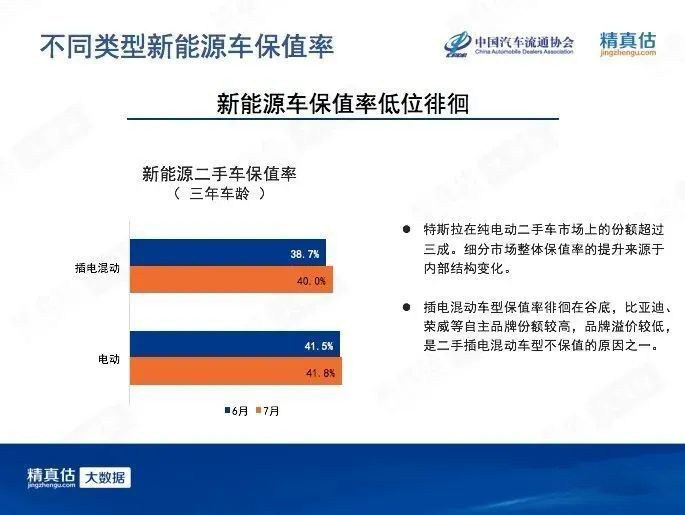 今年8月份,中国汽车流通协会和精真估联合发布了《2020年7月中国汽车保值率研究报告》。其中新能源车7月保值率数据中,插电混动车型三年保值率为40%,纯电车型三年保值率为41.8%。