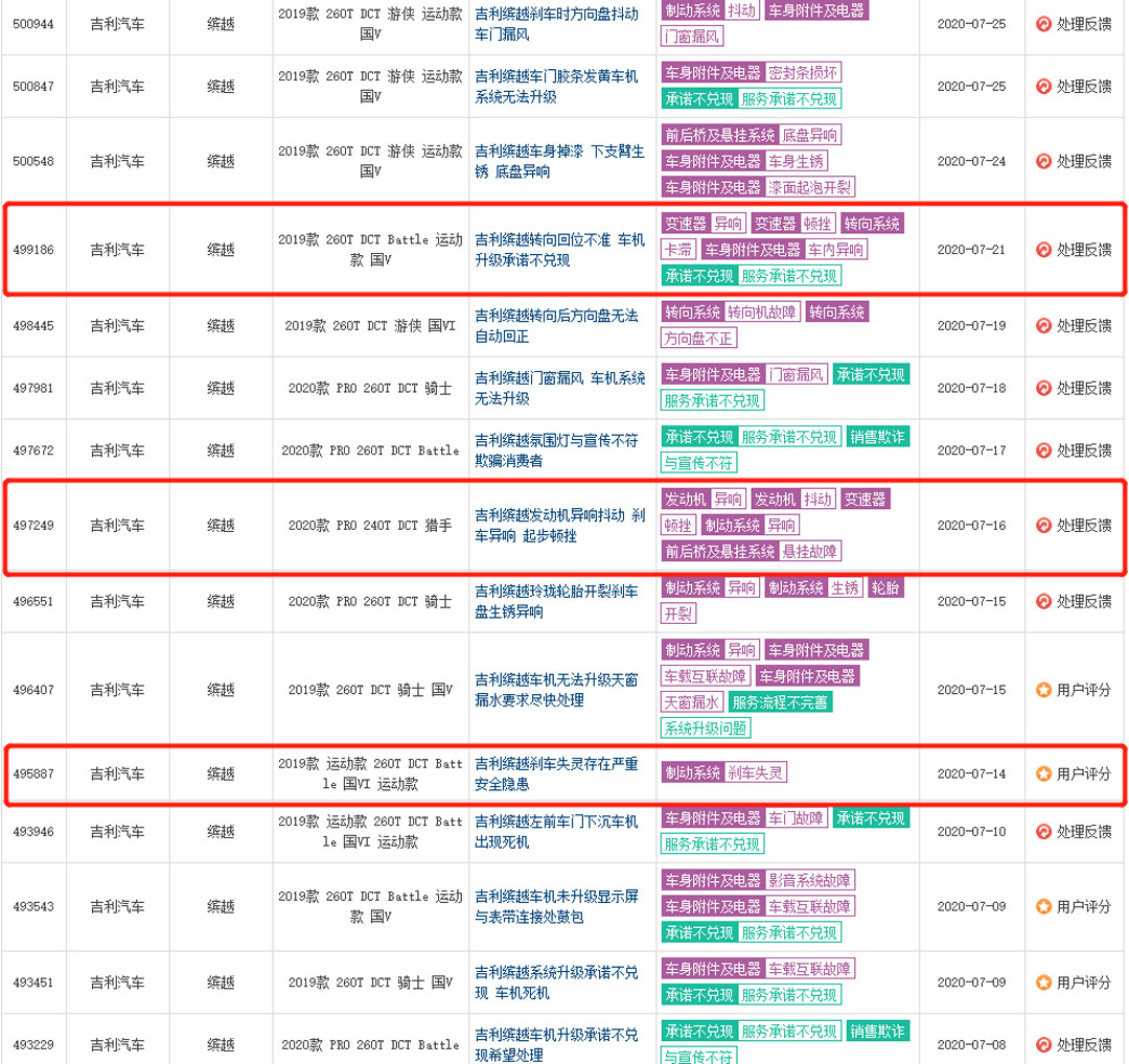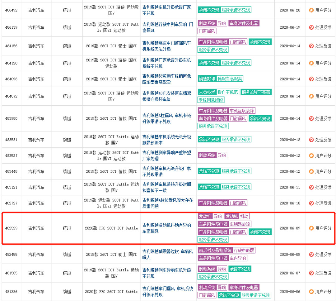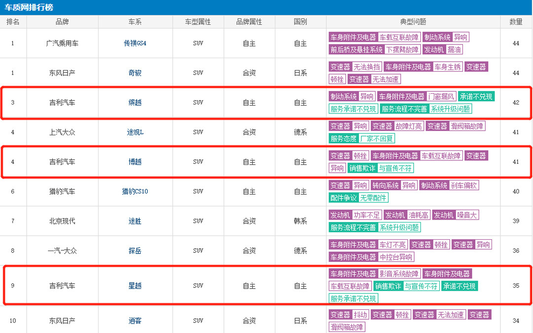 今年上半年5月份,吉利品牌三款主力SUV车型星越,缤越以及博越均登上了排行榜单的前五,其中由于4S点服务,销售欺诈等投诉占了主要,而像发动机异响,转向机故障,变速箱等其他主要部件投诉也占了相当一部分。