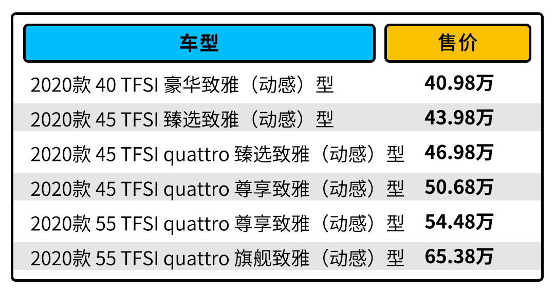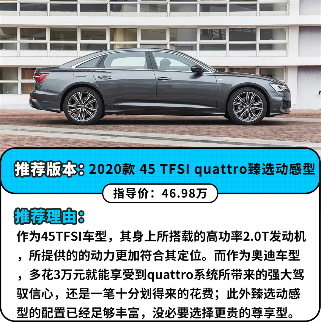 所以说买买君对于2020款奥迪A6L的推荐,自然就是指导价为46.98万元的45 TFSI quattro臻选动感型了;当然,买买君选择动感车型是因为自己年轻人的身份,动感车型的运动套件更符合自己的口味,倘若你不喜欢这么张扬,致雅车型也是一个不错的选择。