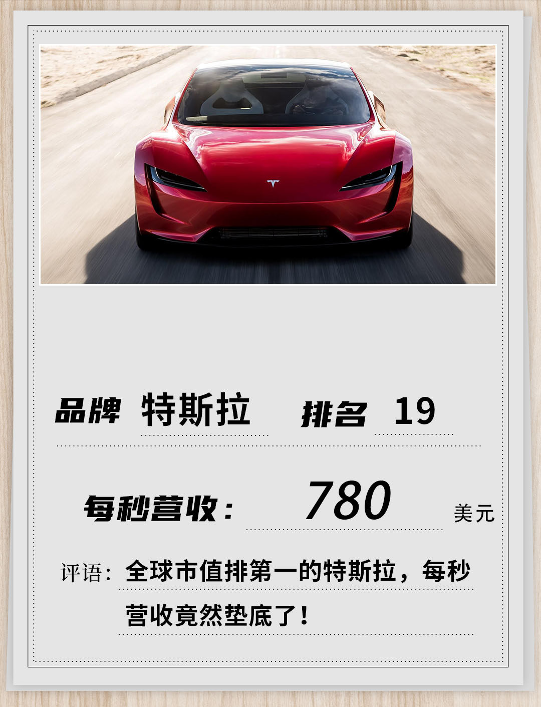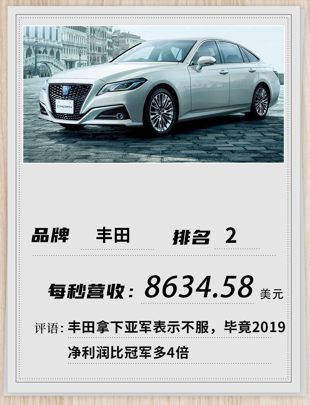 这张视图就非常明确的展示了1-19名的排行结果,而这里我们需要知道两点:一是所谓的公司或集团,营收来源包含旗下子品牌的,例如大众集团涵盖了奥迪、宾利等;其次,统计车企每秒进账的钱≠最终赚到的钱,仅仅是公司/集团的每秒资金流动,如果要说全年净利润那就是另外一回事了。