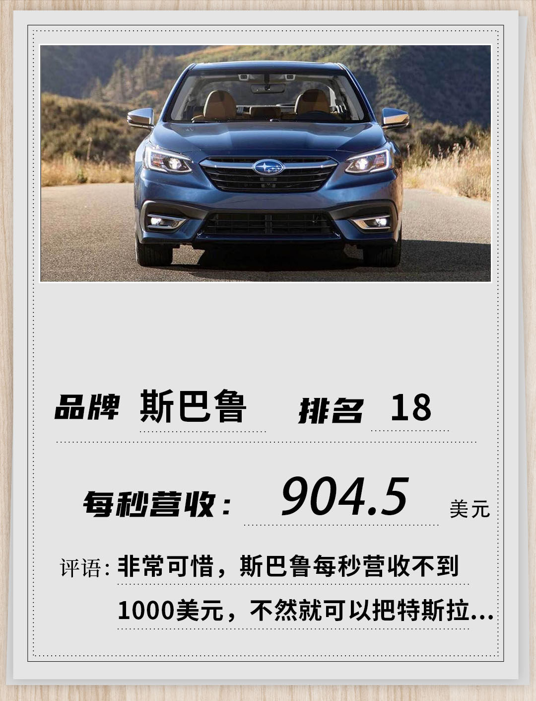 作为传统车企之一,斯巴鲁排在特斯拉前面实属正常,毕竟旗下售卖的车型更多,但它们依然是本次统计中每秒营收不达1000美元的唯二车企。如果斯巴鲁在中国市场能有更好的销售成绩,或许排名还能再靠前。该品牌2019年营收285亿美元,平均每秒904.5美元,约人民币6192元。