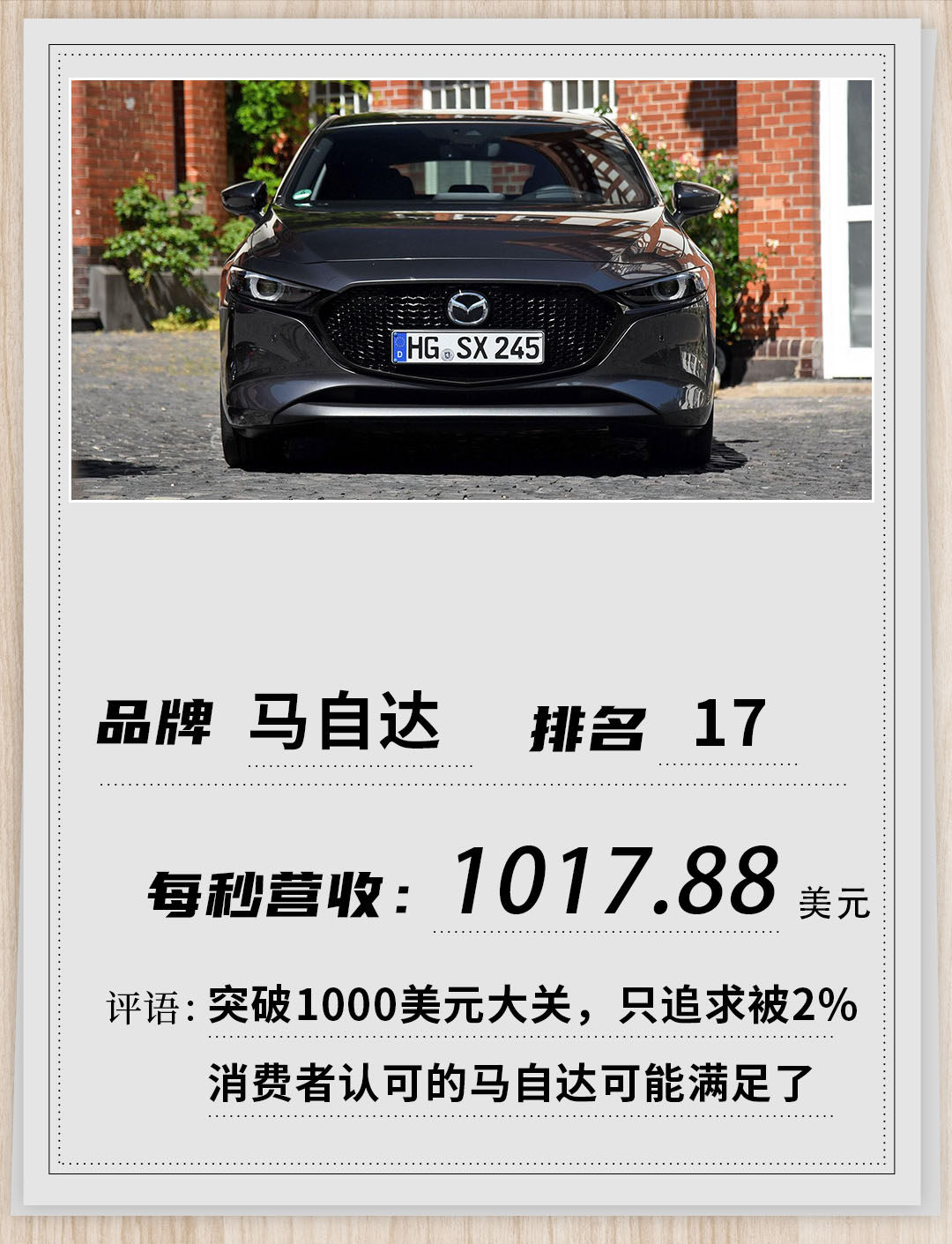马自达2019年营收321亿美元,不过就在今年品牌公布了2019财年营业利润下滑47%,创8年新低,而在本次的榜单中也只能排到倒数第三,平均每秒收入1017.88美元,约人民币7042元。但我们都知道马自达从来都不喜欢跟别人比,它目的是得到全球2%消费者的认可。