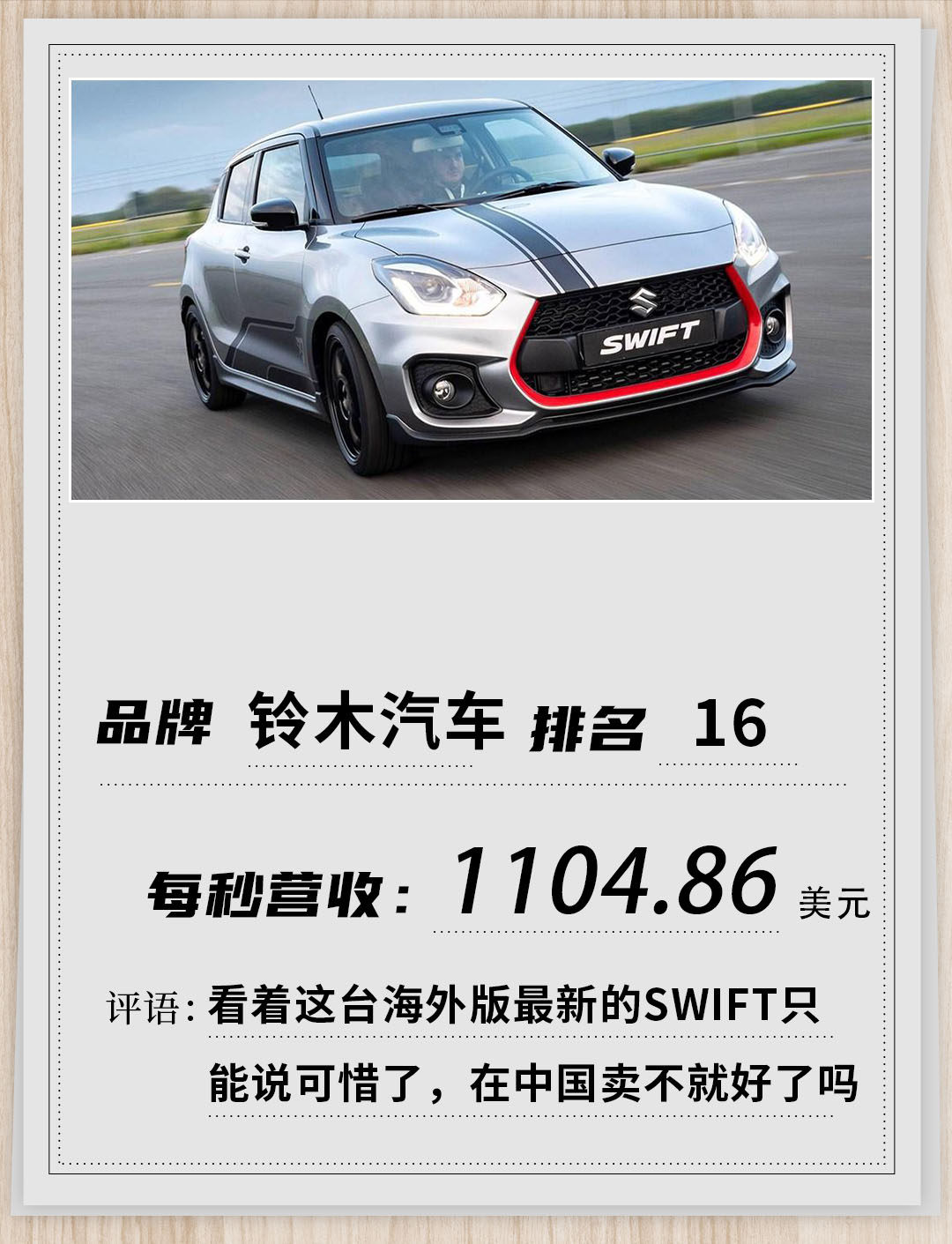 2018年9月宣布退出中国的铃木怕是想念中国了,因为在押注偏爱小型车市场的印度后,今年就遇利润大幅度下滑的困难。其实雨燕、吉姆尼等车型在国内还是挺受欢迎的,无奈这些精品好车都不能买到了。而铃木在2019年每秒营收也达到1104.86美元,约人民币7640元,这么一说市场还是有的。