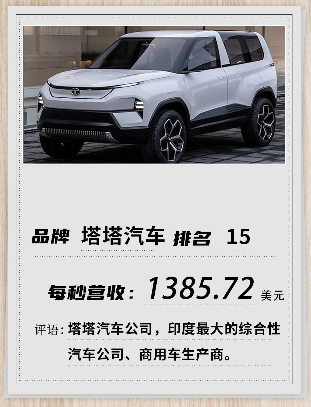 同样是来自印度,塔塔汽车集团排在了铃木之上,而塔塔汽车集团在全球商用车制造商中还能排到前十,所以曾有数据统计,印度公路上每十辆卡车里就有七辆来自塔塔。作为印度影响力较大的车企,塔塔汽车集团旗下还拥有捷豹路虎品牌,综合起来2019年塔塔汽车集团每秒营收138.72美元,约人民币9586元。