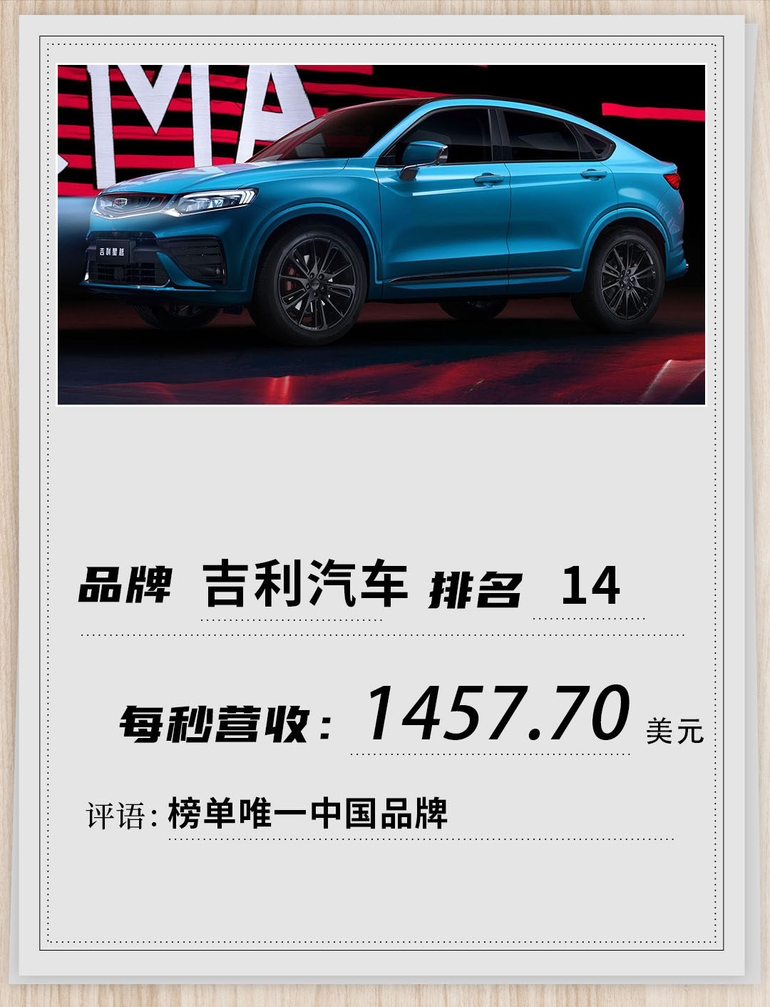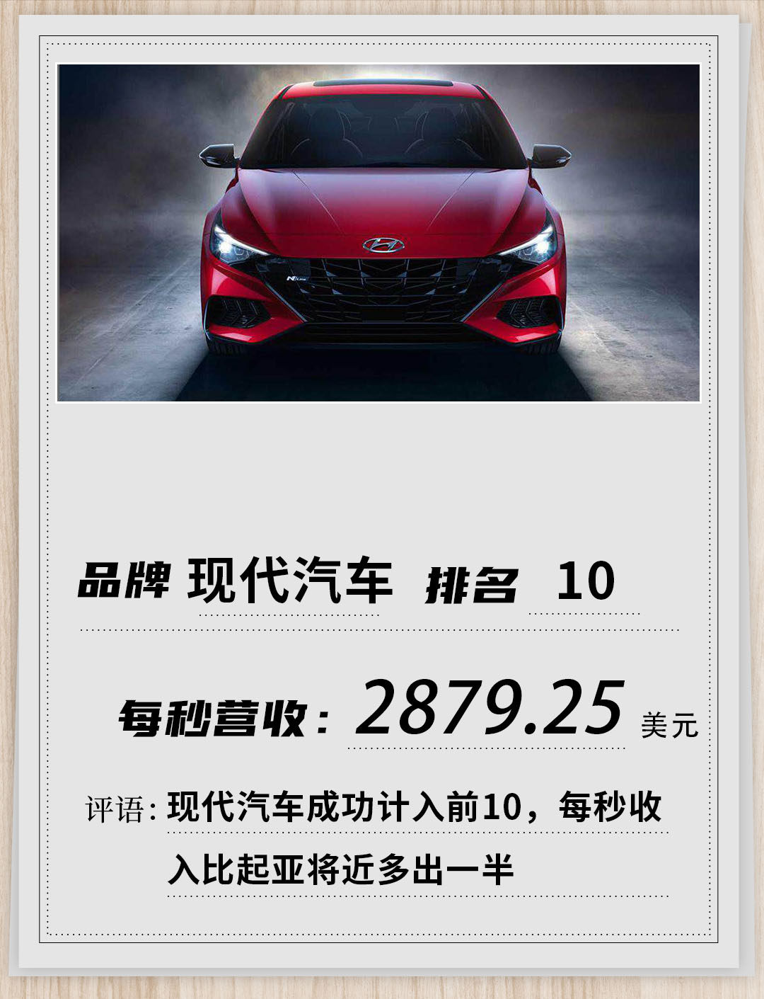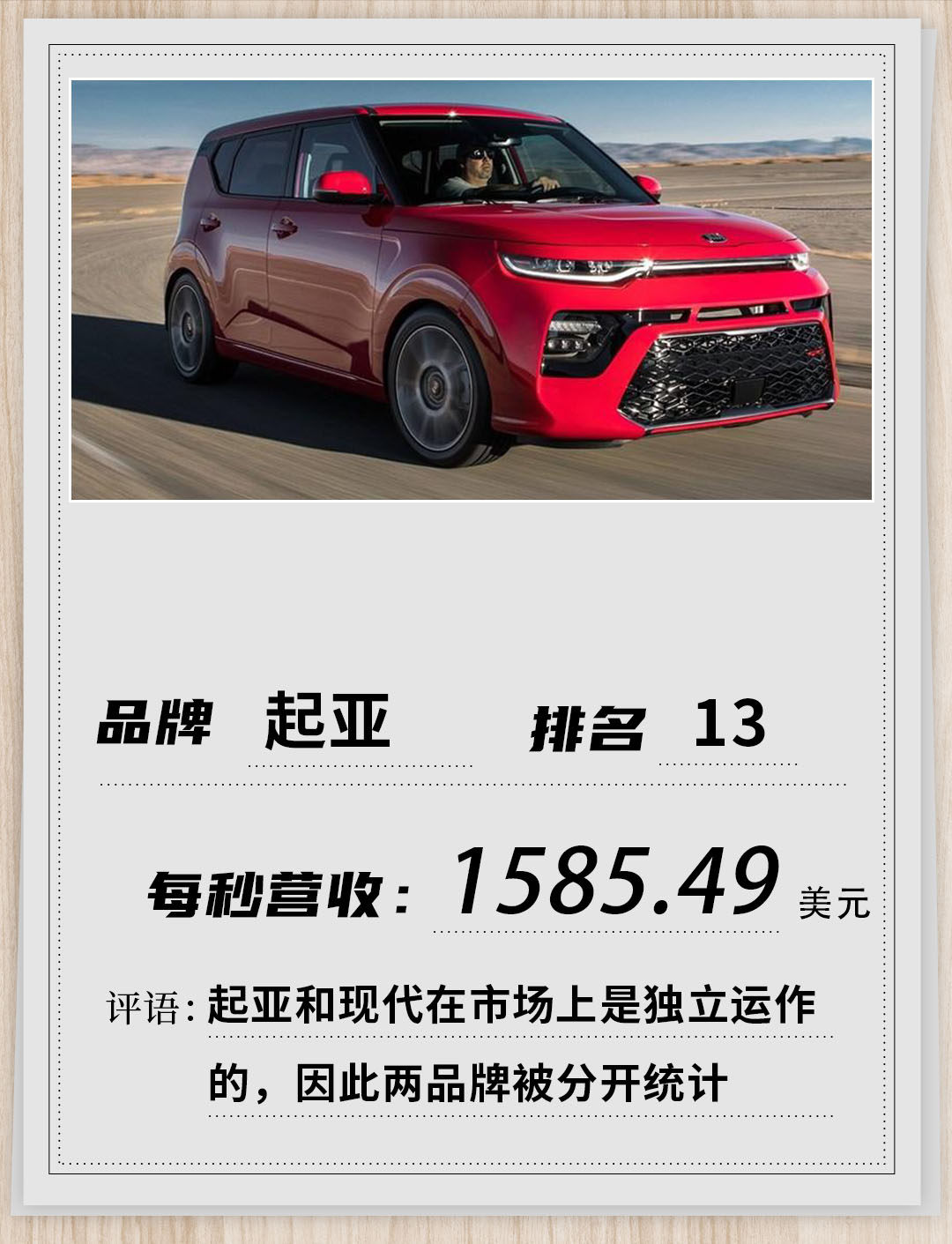 看到起亚可能你会问,起亚和现代不应该以同一集团的名义来统计吗,确实来自韩国的现代汽车和起亚汽车归属于同一集团,不过在终端市场上它们依然是两家品牌,并且拥有不同的销售渠道。至于营收方面,起亚品牌名次比现代更靠后,位列第13名,其每秒营收1585.49美元,约人民币10968元。