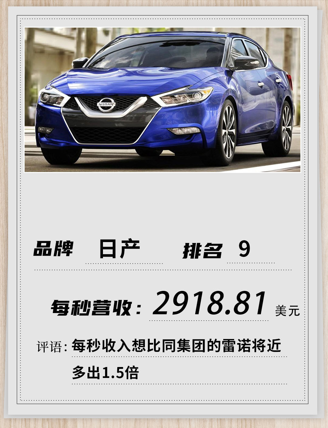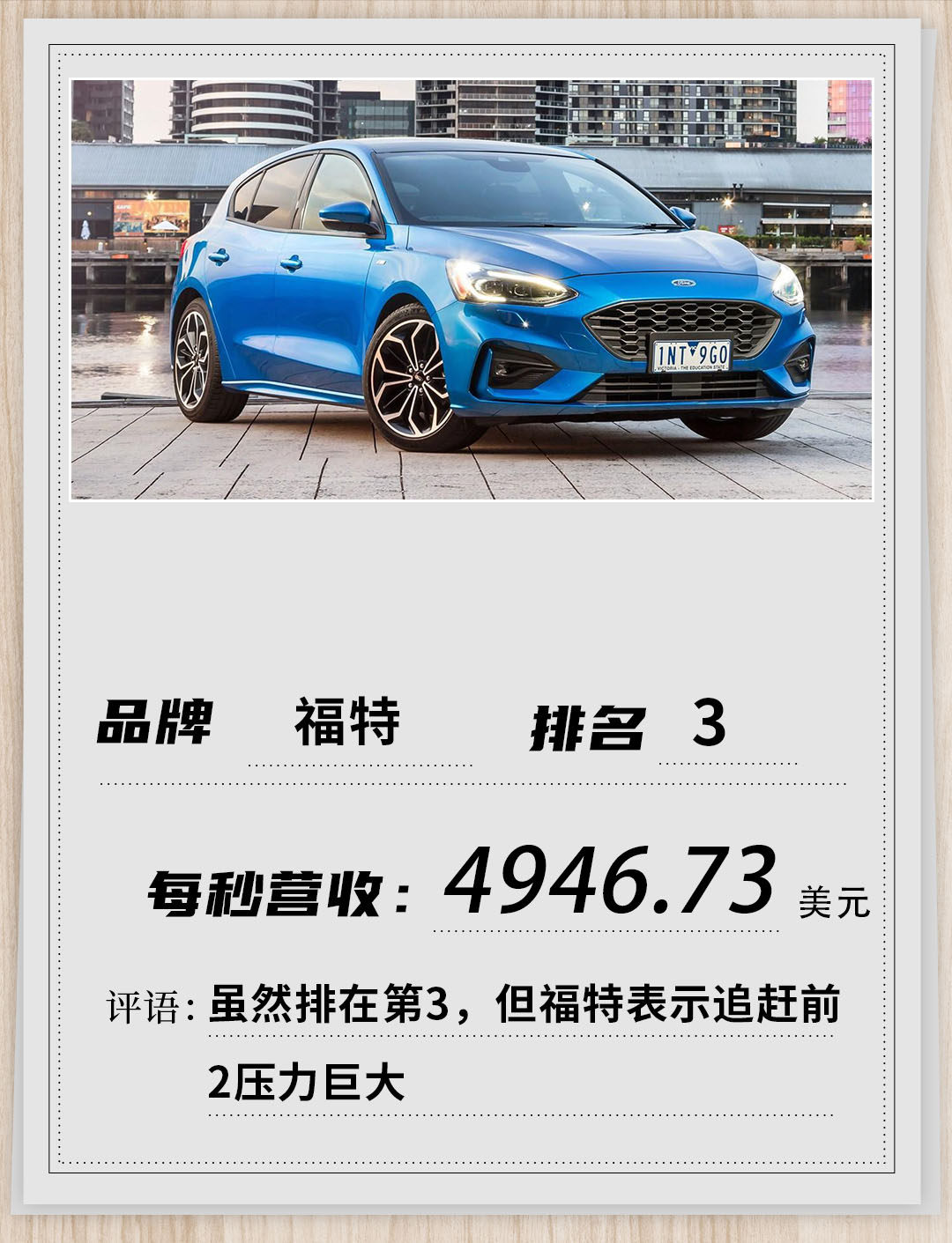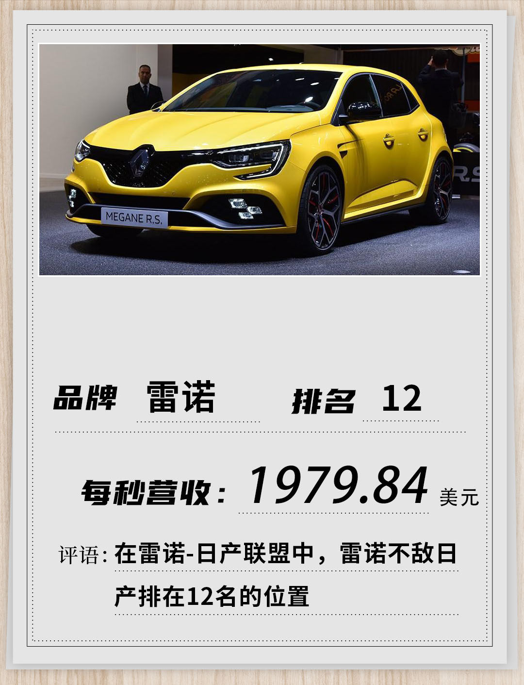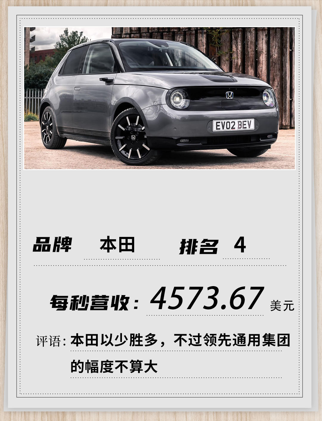 说实话第6名比较“出奇”,在国内表现一般的FCA集团每秒竟营收3856.1美元,约人民币26676元,排在奔驰宝马前面。还是那一句,比较期待FCA与PSA集团合并后的成果,毕竟该集团称未来将对中国市场制定全新的计划。