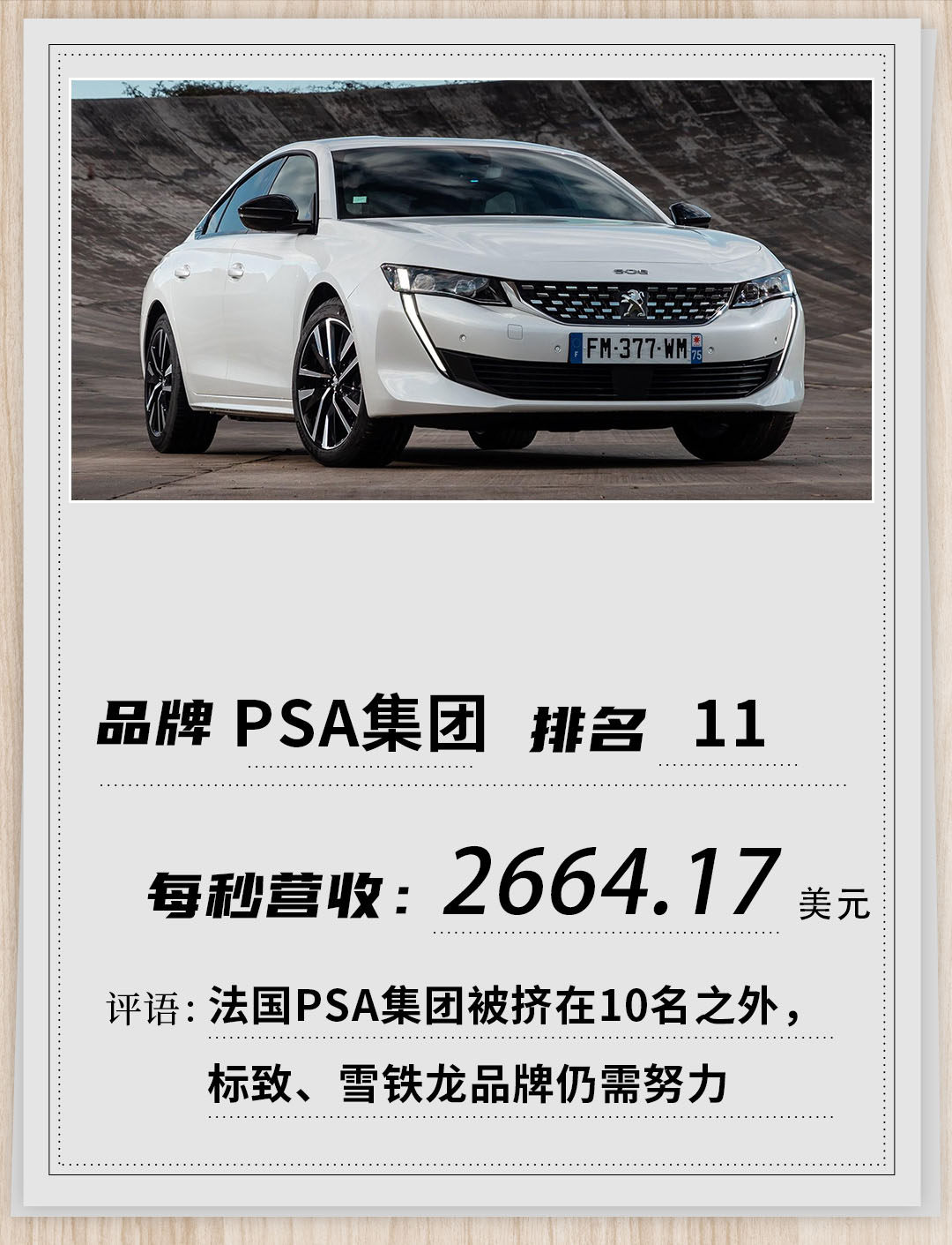 比较可惜,和雷诺同样来自法国的PSA集团(标致雪铁龙集团)与前10只差一步之遥,其2019年每秒营收2664.17美元,约人民币18430元。值得一提,PSA集团与FCA集团(菲亚特克莱斯勒集团)在今年7月共同宣布,双方合并后的企业将命名为“STELLANTIS”,含义是“用繁星照亮”,下一步双方将公布新的集团LOGO,希望这一波抱团取暖能为PSA集团照亮前路。