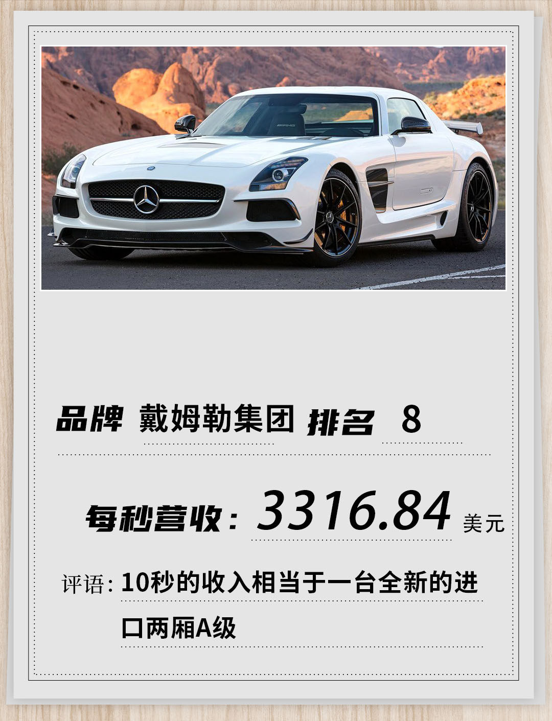 到了第8名,终于有德系豪华品牌的出现了,梅赛德斯·奔驰的母公司戴姆勒集团在2019年每秒到账3316.84美元,约人民币22946元,该集团在2019年总营收达到1046亿美元,在打完这句话后又有一辆全新进口A级的钱到达戴姆勒集团了。另外,今年上半年奔驰品牌在国内以小幅度优势反超宝马,重拾国内豪华品牌销量冠军。