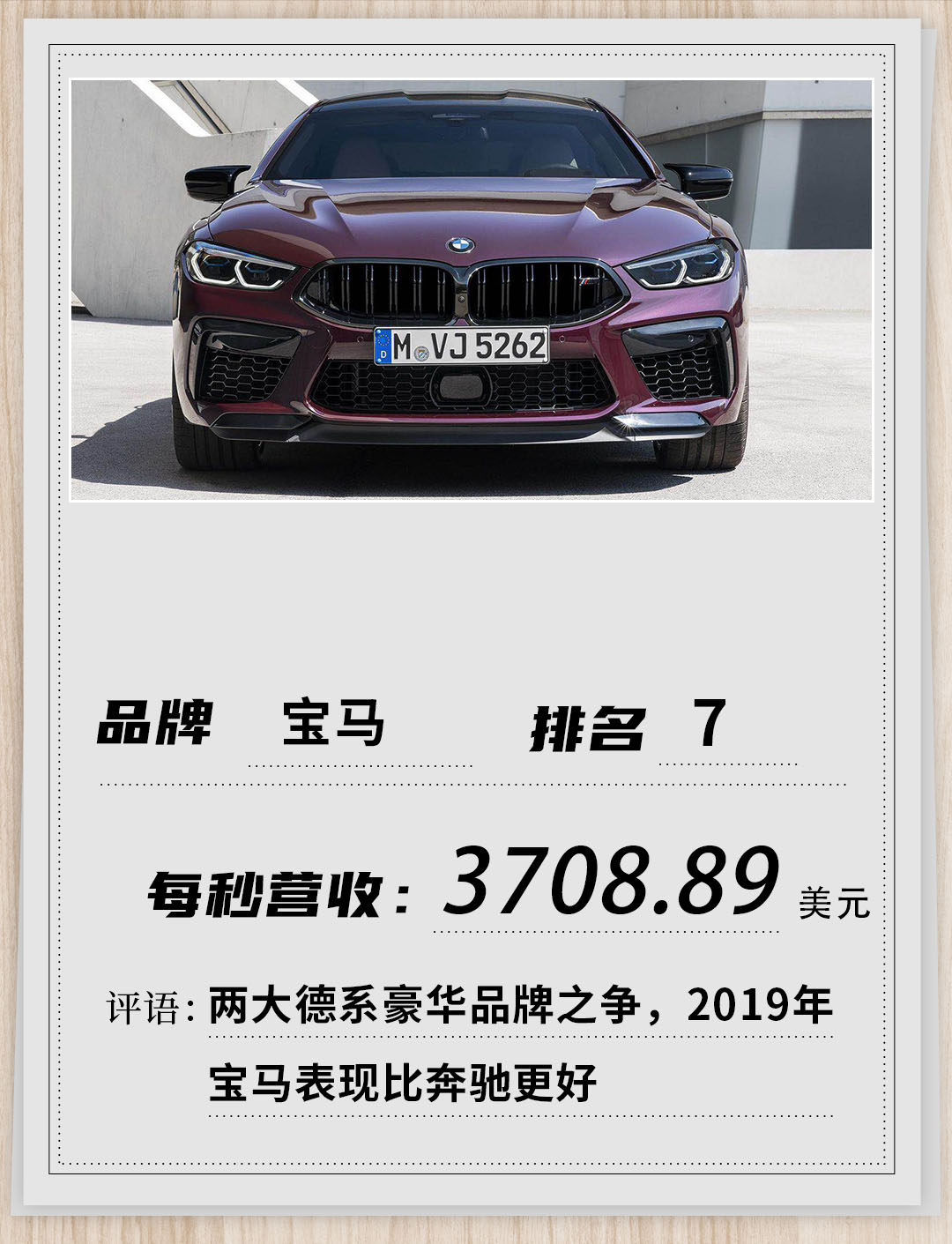 另一个来自德国的豪华品牌宝马则排在奔驰之前,以每秒赚到3708.89美元,约人民币25658元的成绩拿下第7名。2019年宝马在国内成功夺下豪华品牌销冠,不过到了今年上半年奔驰实现反超,不知道2020的进账结果又会如何?