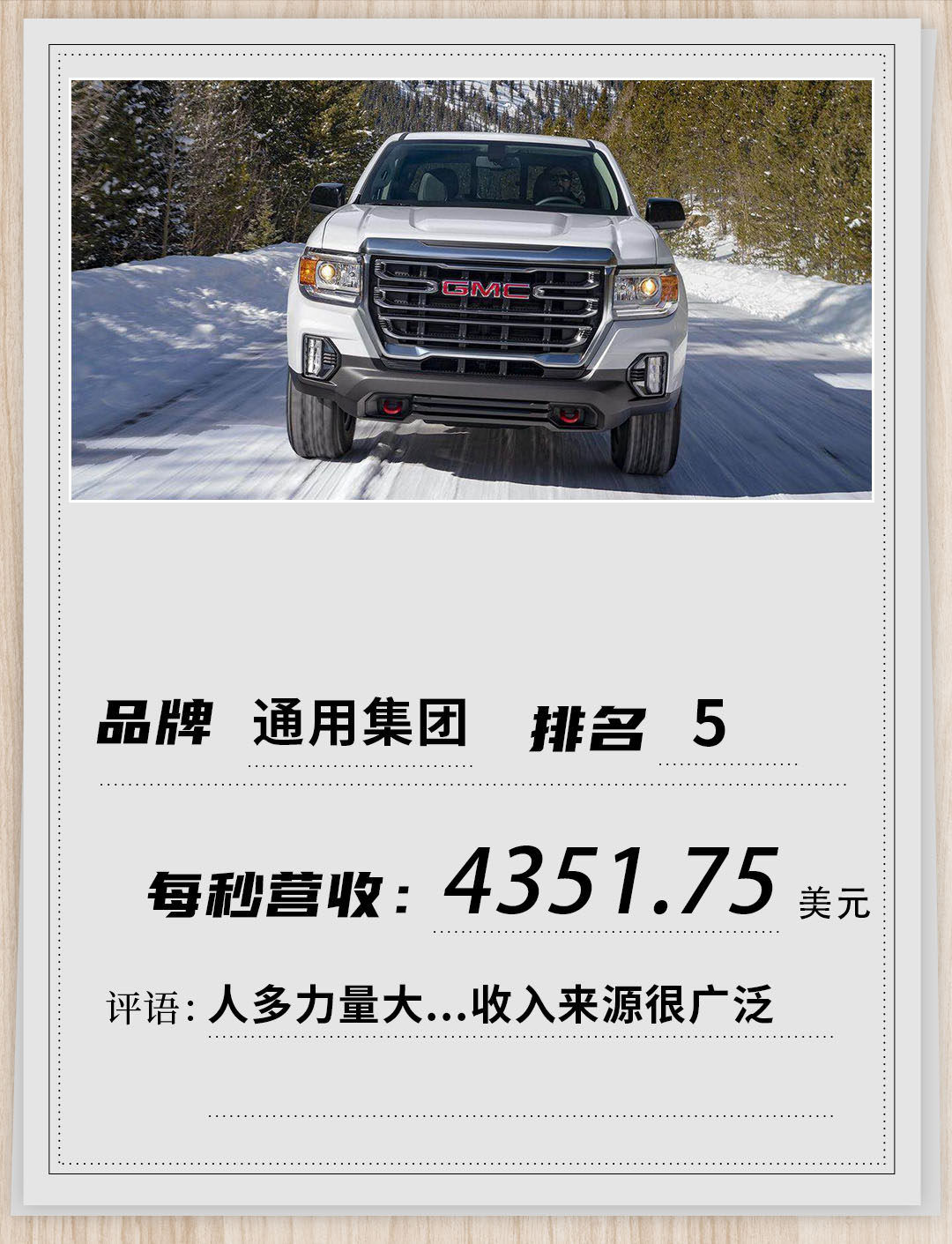 接下来开始到大牌、大集团出现了,排名第5的是通用汽车集团,该集团旗下包括凯迪拉克、雪佛兰以及别克品牌,可以说人多力量大,收入来源很广泛。而通用集团在2019年每秒营收为4351.75美元,约人民币29874元。