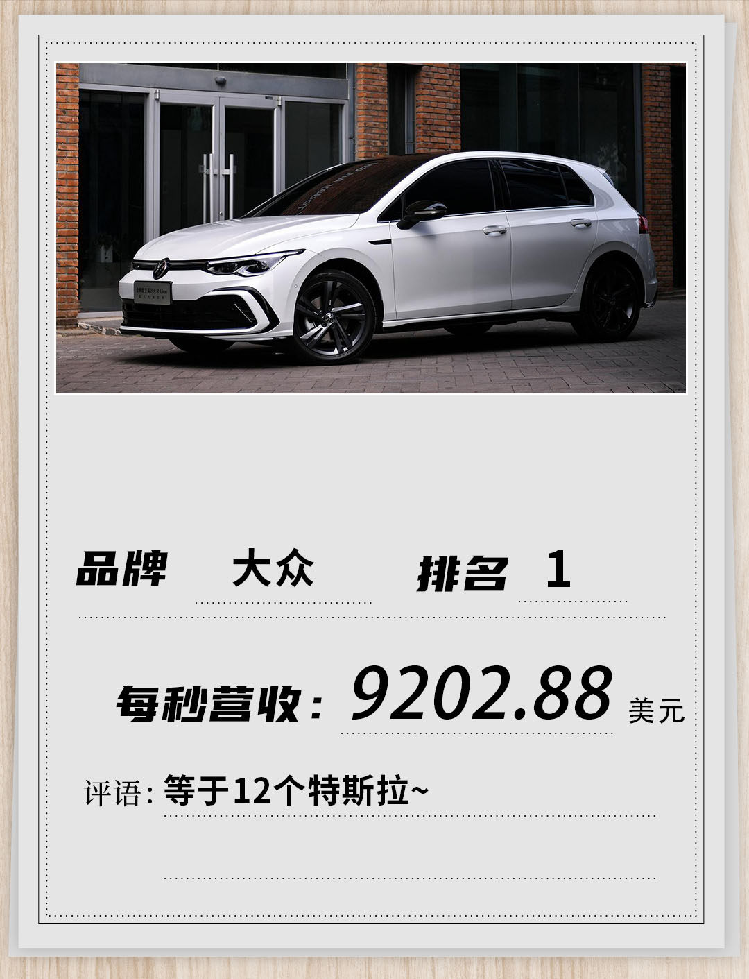 冠军没有任何疑问,属于大众集团,相比之下大众集团有点“偷步”了,该集团旗下有我们熟悉的奥迪、宾利、兰博基尼、保时捷等,除去大众品牌之外,这几个单一车型价格都不便宜的品牌确实贡献了不少。2019年大众集团每秒营收达到9202.88美元,约人民币63664元,约等于9个马自达、10个斯巴鲁、12个特斯拉...