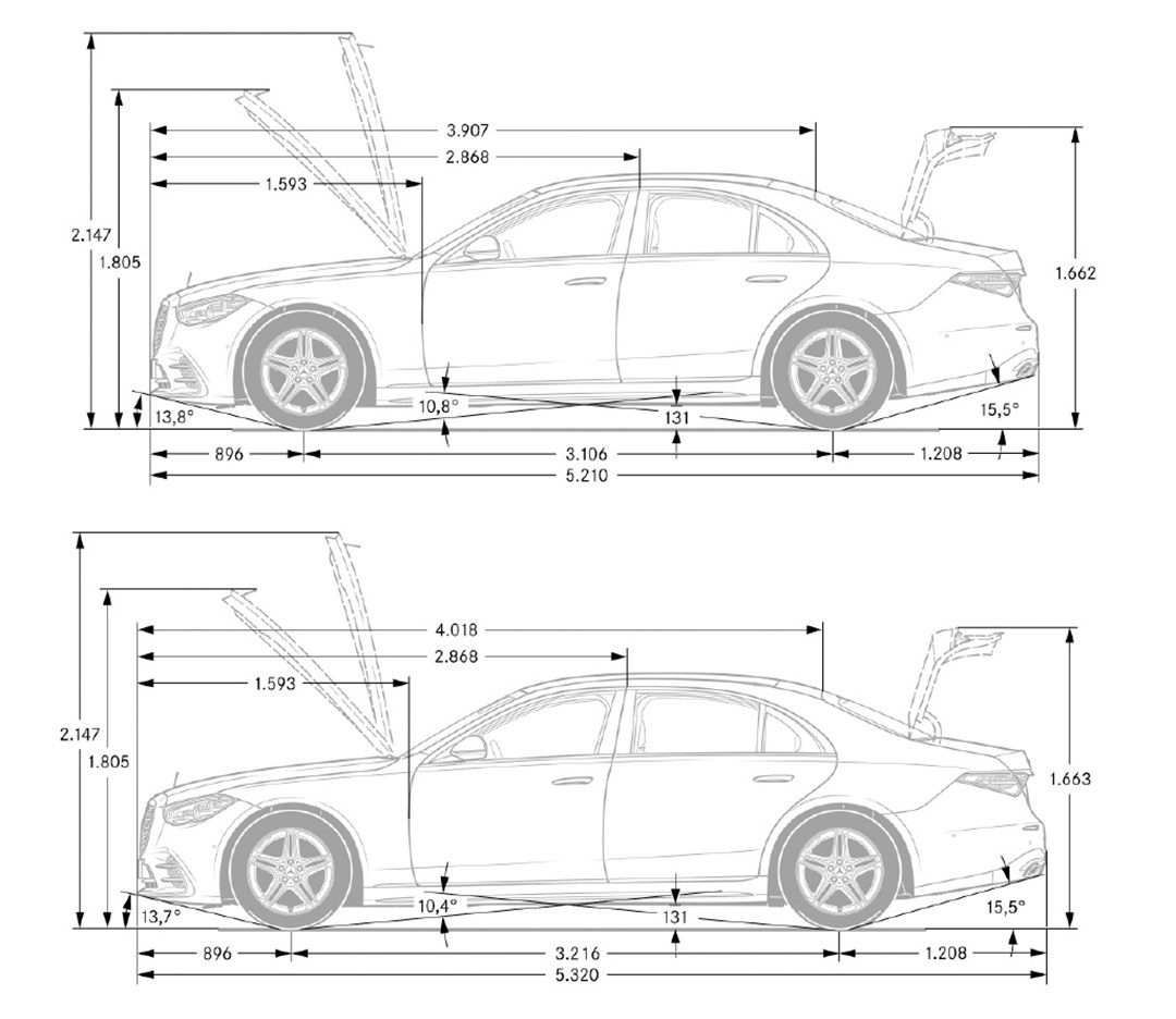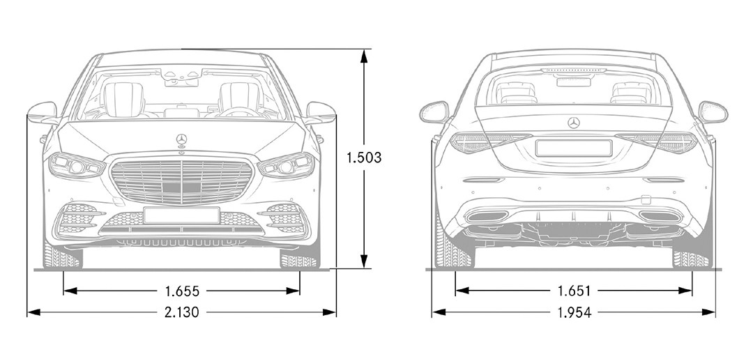 换代后的S级也对车身尺寸进行了升级,车身宽度增加了49mm达到1954mm,轴距也从旧款车型的3165mm增长至3216mm(标准轴距版本由2945mm增长至3106mm)。