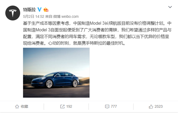但有句俗话说得好,无风不起浪,虽然特斯拉官方进行了辟谣,但今年5月2日,特斯拉官微还义正言辞的声称,国产Model 3长续航版没有调价计划。