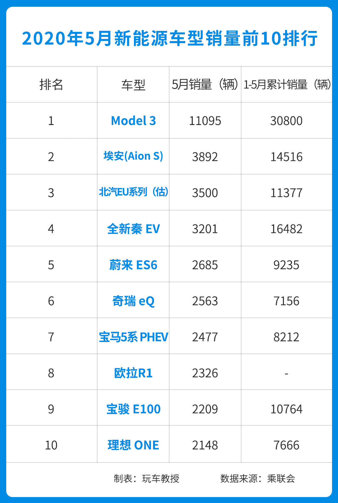 其中,5月Model 3销量一波暴涨,卖出11095辆,比第二名广汽新能源Aion S 3892辆销量的2倍还多。值得注意的是,这个月全国纯电动车销量5.6万辆,单国产Model 3就占了将近20%。