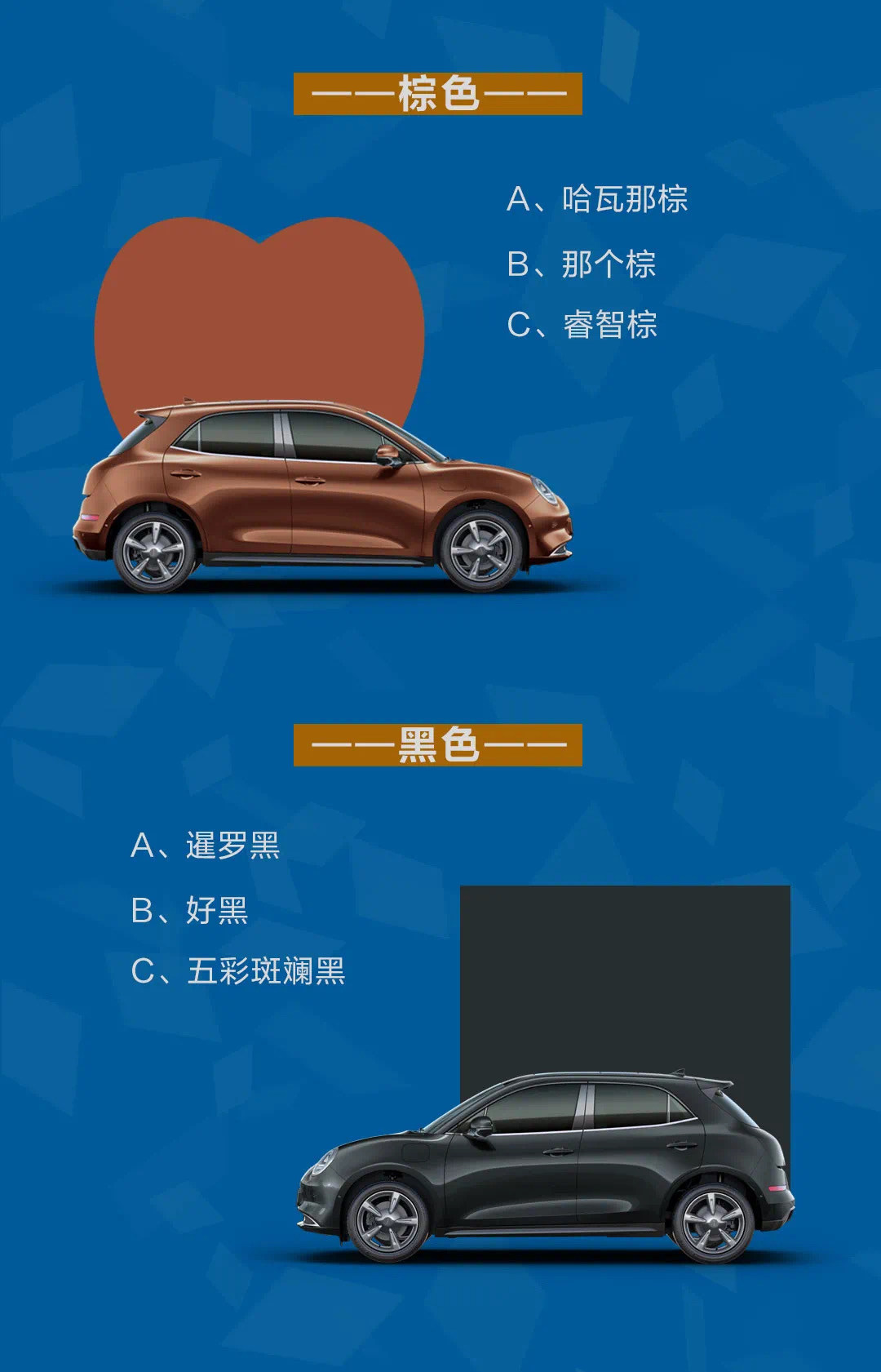 官方推出提供黑色、白色、棕色、蓝色、米色、金色、绿色、红色共计8款颜色,以及提供24个备选名称共网友选择。