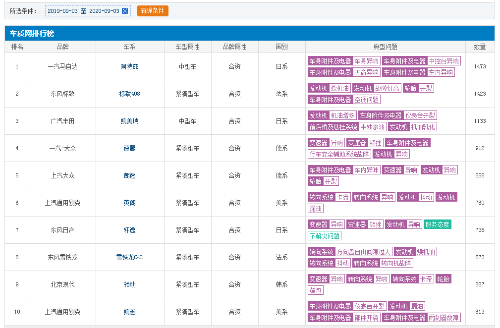 另外我们在查阅车质网近一年的投诉排行榜时,发现投诉前十的车型中,都是清一色的合资品牌,没有哪怕一款国产车型。
