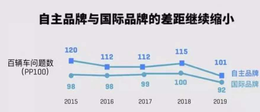 衡量车子质量如何,百车故障率最有说服力。来自J.D. Power的数据显示,国产品牌百车故障率从2015年的120个降低到2019年的101个,5年来和国际品牌的差距从22个缩短到9个。说明目前国产品牌与国际品牌在产品质量上虽然仍有差距,但差距在不断缩小。