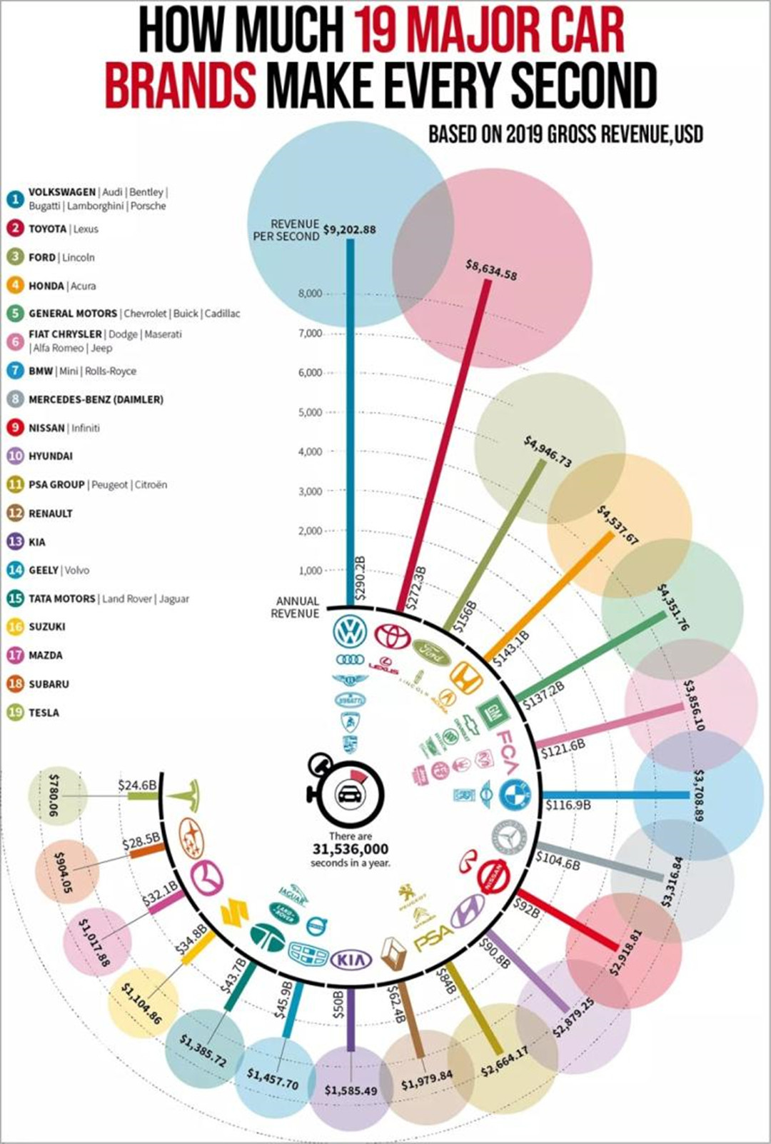前一阵子,有一家资本机构统计了去年19家大型跨国车企的营收情况;其中作为跨国车企销量王的大众集团,凭借着单车1.37万元的利润,在2019年获得了每秒近6.4万元人民币的收入,毫无意外的登上了这份榜单的榜首位置。