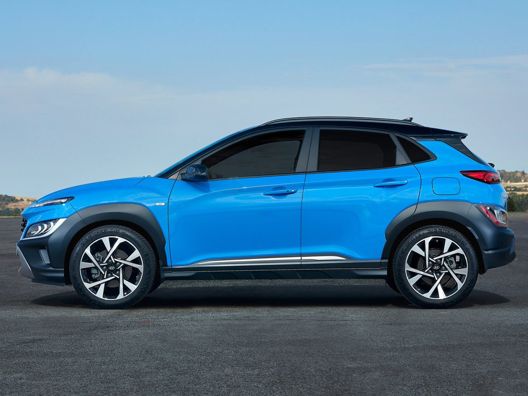 侧面部分,KONA使用悬浮式车顶的设计,为了增加SUV的味道,还特意在车顶上增加了行李架轨道。值得一提的是,N Line版本跟普通版本的轮毂样式并不一样,N Line版本的轮毂样式更为繁杂些,虽然造型很好看,但是当你洗车的时候,就会发现这种复杂轮毂让你相当头疼。