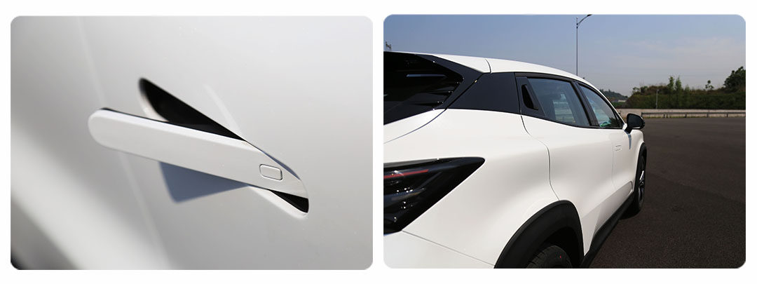 而从侧面看车辆前后车门都采用有隐藏式门把手的造型,前车门把手采用弹出式设计,而后车门把手隐藏在车窗后面黑色区域。但后车窗线条向上延伸形成的特殊车窗造型,难免还是会对后排采光带来一定影响。而对于一款车身尺寸为4515/1870/1565mm,轴距仅有2710mm的SUV而言,20英寸的轮毂在车身侧面确实足够抢眼。