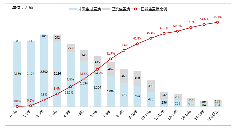 据中汽研调研数据统计,新车车龄2年已开始置换,而3年车龄的置换比例达到4.3%,7-8年置换比例已远远超过30%。这份数据调查还未算上直接卖车或转让给他人的,如若加上,相信比例会更高。