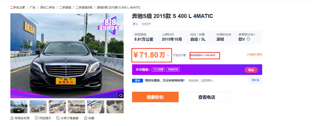 以一台2015款奔驰S400 4MATIC为例,当时新车落地价在146万左右,而到2020年二手车商报价71.8万元,五年时间近乎贬值了一半,当然二手车报价存在很多不确定因素,比如水泡车和事故车等。