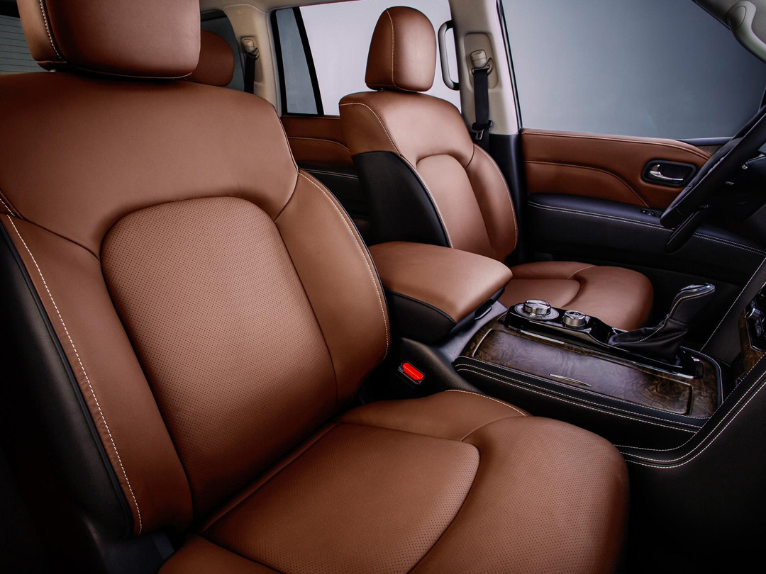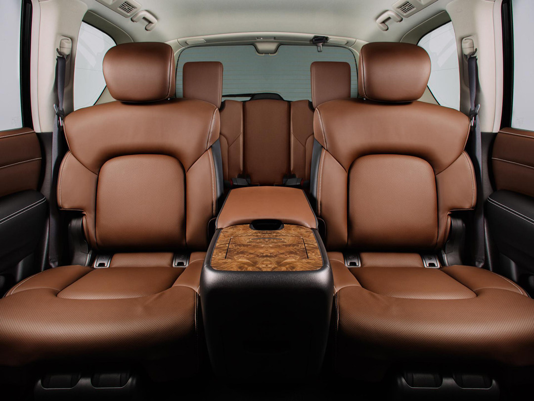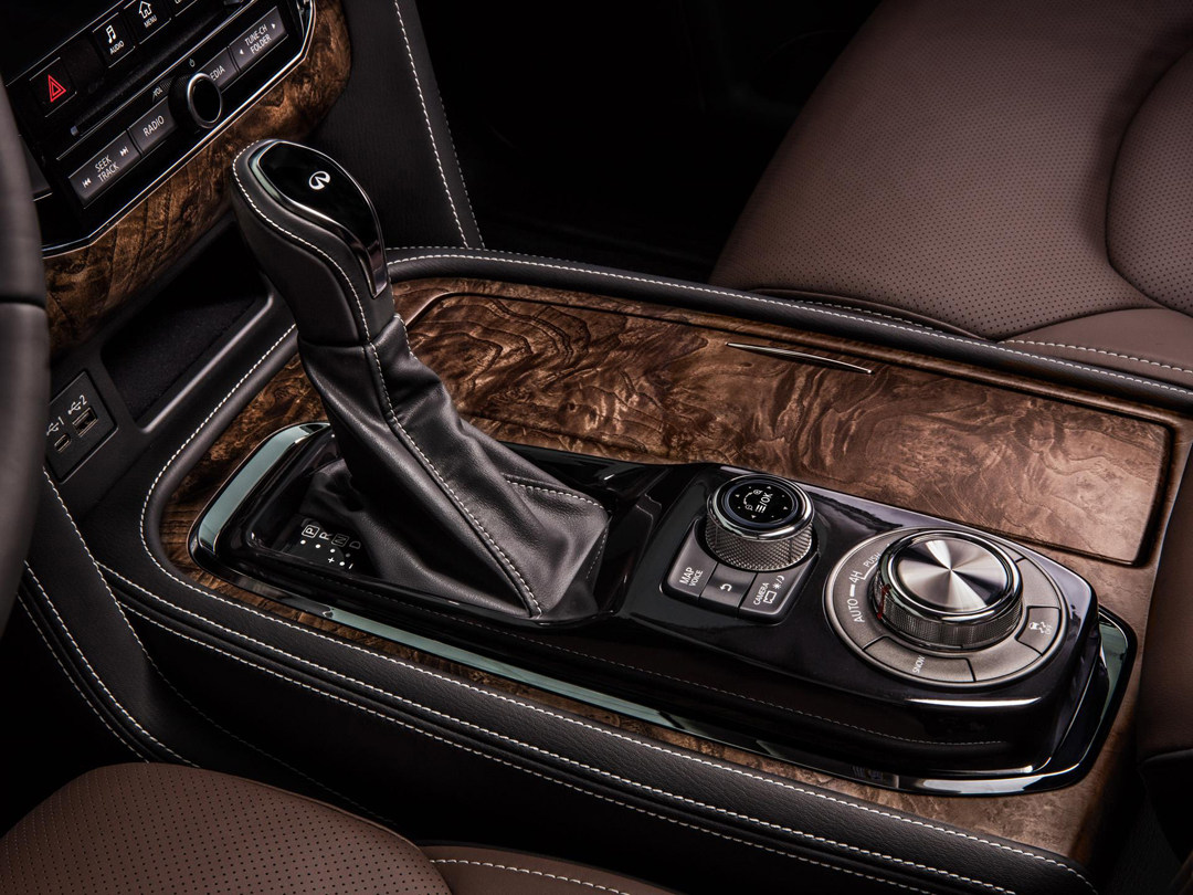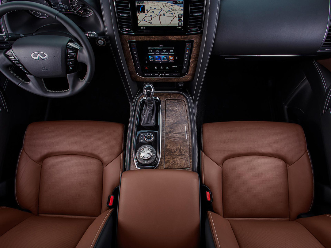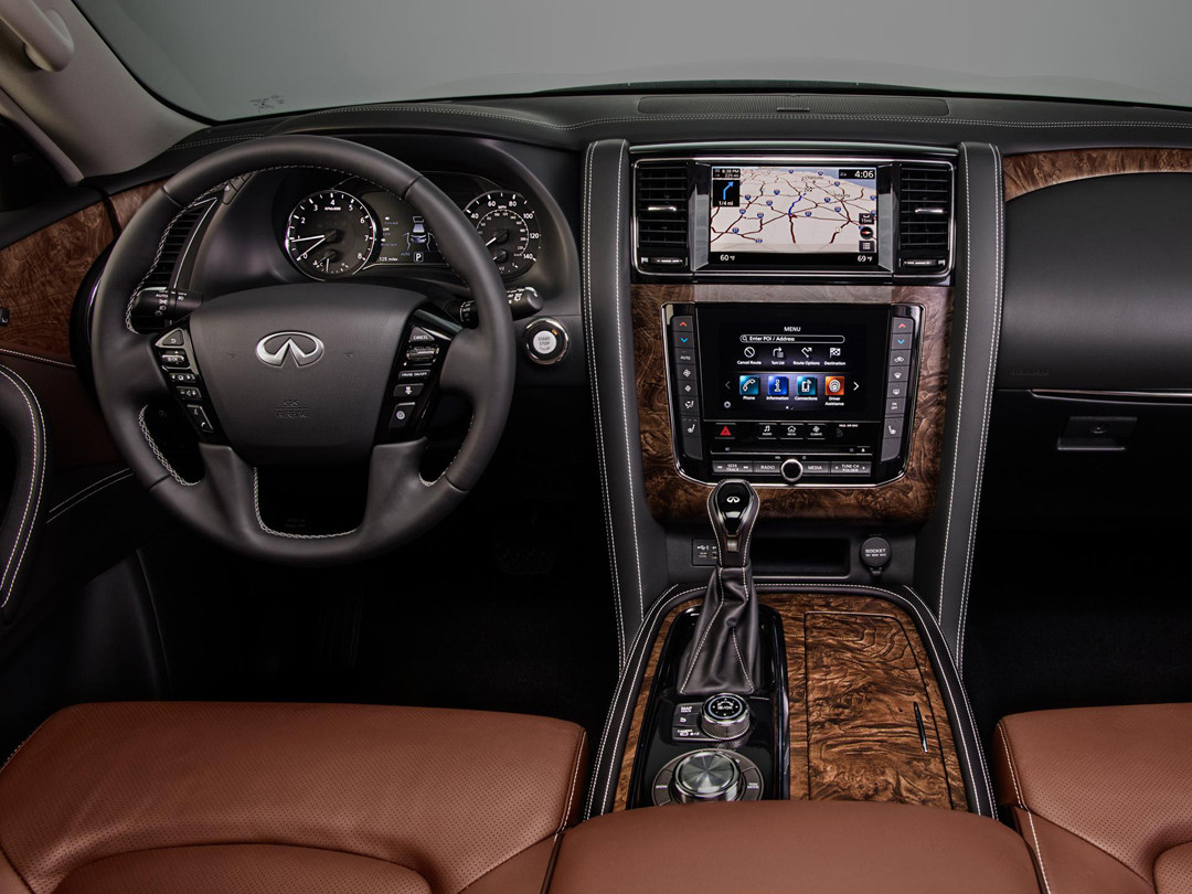 内饰方面,QX80依然延续了老款车型的四辐式方向盘,在这个级别,就不需要担心车厢内部的用料了,全车大面积使用真皮包裹,并且配以白色缝线。对称式的环抱中控台在QX80上感觉相当和谐。除此以外,车内还大量运用桃木装饰,颇有美式老家具的味道;中控上下两块屏幕的设计在英菲尼迪很多车型上都出现过,上面屏幕负责显示导航信息,下面的负责车辆功能性控制。
