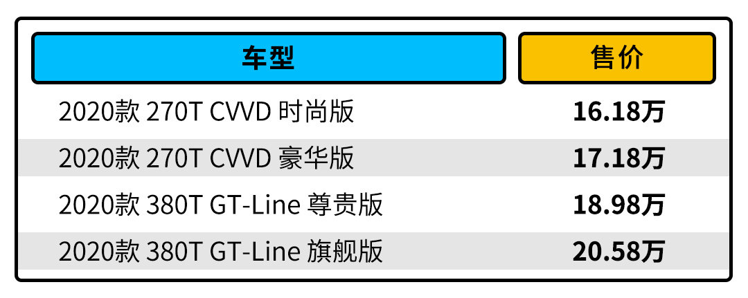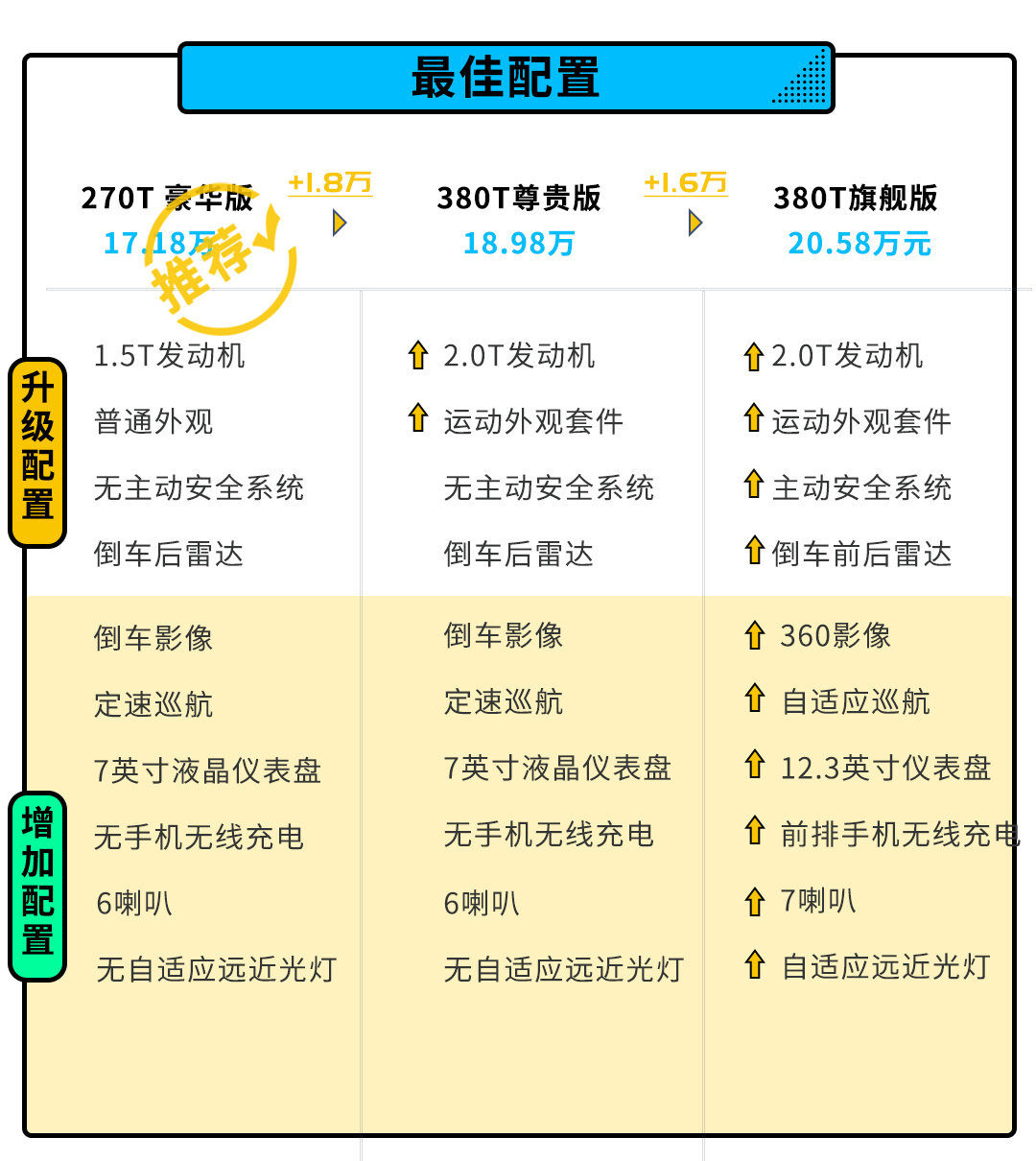 不难看出由于丰富的标准配置,270T的顶配车型与380T入门版车型在配置上并没有太大的差距。最大的不同就出在动力系统上,不过介于其动力参数不错的1.5T发动机,普通家庭完全没有必要选择2.0T车型,省下这1.8万元完全可以选装多个选装包来获得更为完善的体验。