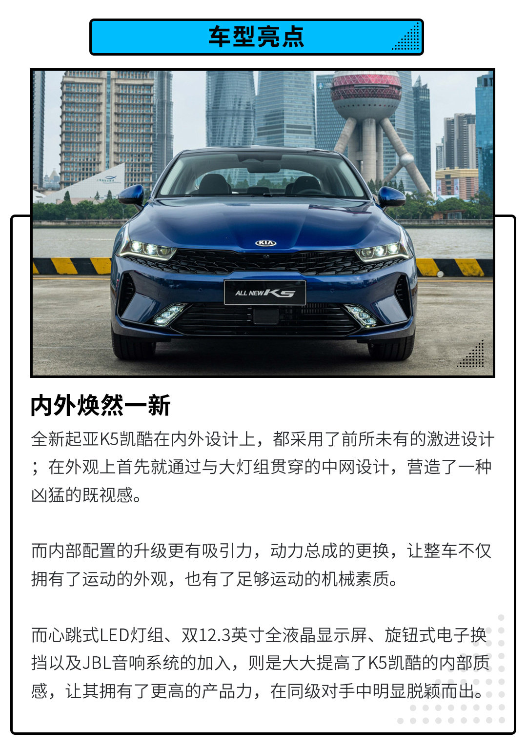 全新K5凯酷与上一代K5相比,可谓是发生了翻天覆地的大变化,无论是车身尺寸的全面增大,还是外观内饰的全新设计上,都体现出了全新K5凯酷的野心;而配置和动力的升级则是其底气所在,参数强劲的动力系统搭配着配置满满的驾驶座舱,让其产品力呼之欲出。