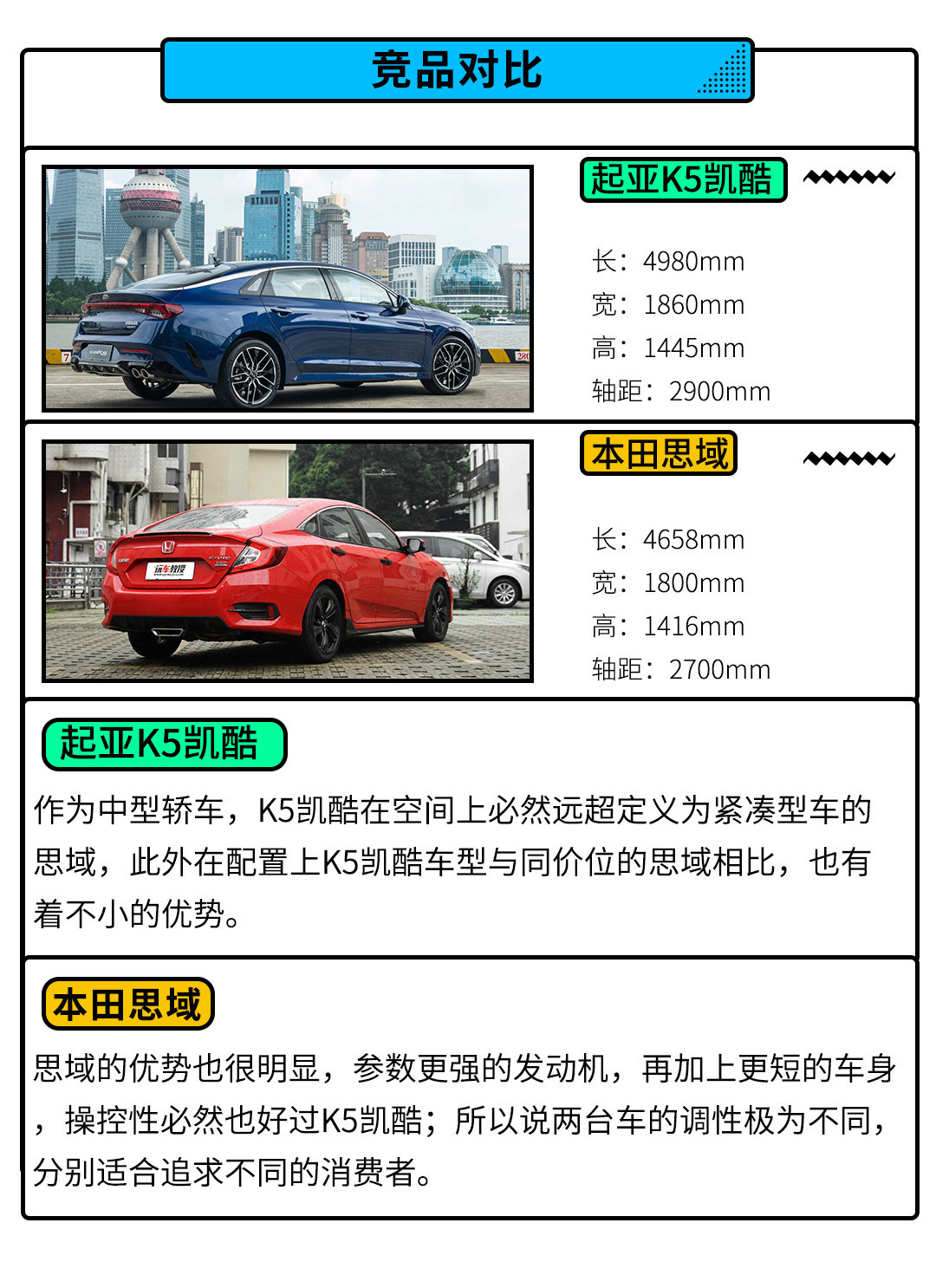 说到16万价位,再加上运动车型,很多人第一反应就是本田的思域,没错现在看来新上市的K5凯酷直面面对的对手,便就是思域了。不过就如同上面所说,思域与K5凯酷的调性虽然都为运动,但是各自钻研不同。思域主攻的是驾驶感与操控感,但K5凯酷明显是想在保证质感的同时有些许运动感,所以两者所吸引的消费者群体重叠不多,应该不会在市场中发生太大的冲突。