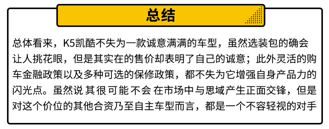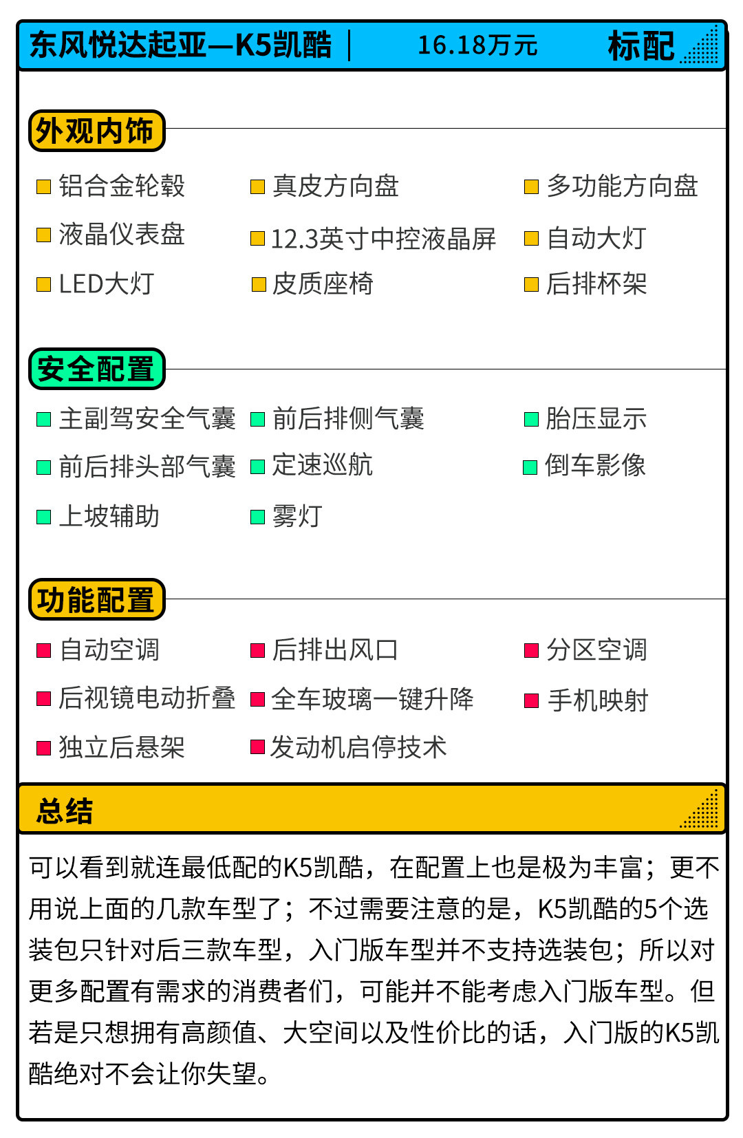 不过“车无完车”在K5凯酷上也同样适用,虽然其全新的激进设计可能会吸引到相当一部分年轻消费者的注意力,但又正是因为这种与上一代相差太大的激进风格,很可能会让部分K5的忠实粉丝难以接受;此外项目繁多的选装包项目,虽然价格合适但也可能会让有“强迫症”的消费者难以抉择。话说到这里,不得不承认全新K5凯酷的配置那是相当高,全系标配了不少同价位车型上很难看到配置,如下图所示。