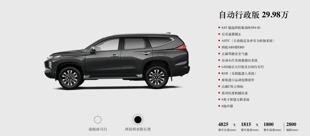 近日,三菱汽车官方宣布,旗下帕杰罗·劲畅车系新增一款配置,新车售价为29.98万元,与其他配置相比,该配置最大的不同在于外观上,其配备了原装运动包围套件。外观部分,帕杰罗·劲畅前脸采用了Dynamic Shield设计语言,在保持了原有“X”造型的同时,镀铬装饰件的加入,也使得整个前脸看上去更加的气派。另外,新增加的原装进口运动包围套件,进一步强化了帕杰罗·劲畅的越野属性。内饰方面,整体的设计以实用为主,功能区域的划分相当清晰,中控台上也大量的采用了软面材料和双缝线装饰,大幅提升触感和品质。动力部分,新车继续搭载代号为6B31的3.0L V6发动机,最大马力209Ps,最大扭矩291N·m,与其匹配的是一台爱信的8速自动变速箱,并配备第二代超选四轮驱动(SS4-II)系统,不过遗憾的是,该发动机目前仅符合国五标准。
