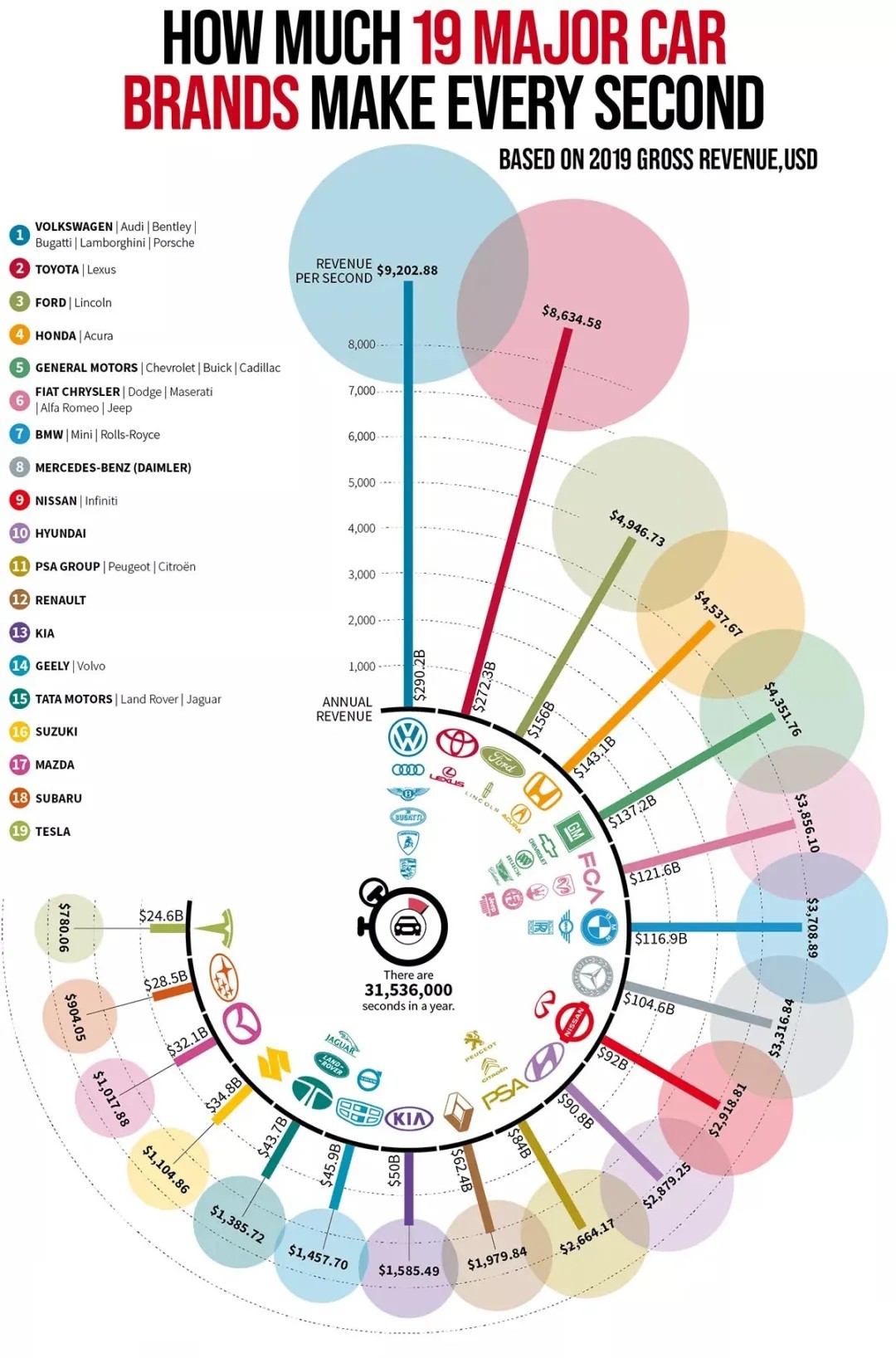 日前,有资本机构计统计了19家大型跨国汽车制造商在2019年的全球销量,以及这19个车企每秒钟的营收情况,这些车企到底有着怎么样的表现,第一名的每秒收入多少呢?当然,这并不仅限于单一品牌,还包括了集团下的其它品牌。