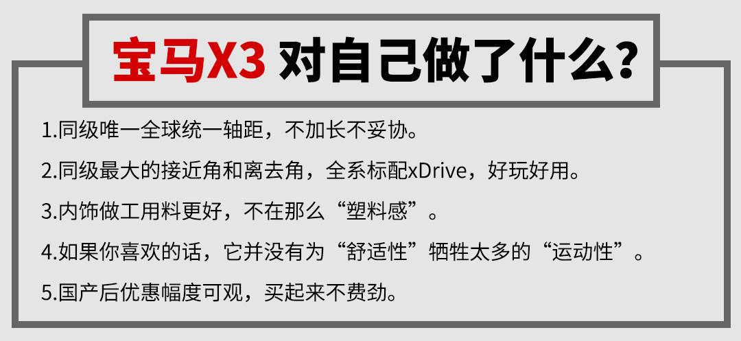 如果把豪华品牌入华普遍的“加长轴距”视为一种讨好手段,那宝马X3确实不这样。但是它用了一种更巧妙的手法——先做好自己再讨好别人!这一套理解起来不那么直观,就看你是沉迷于数据解读还是直接上手开。