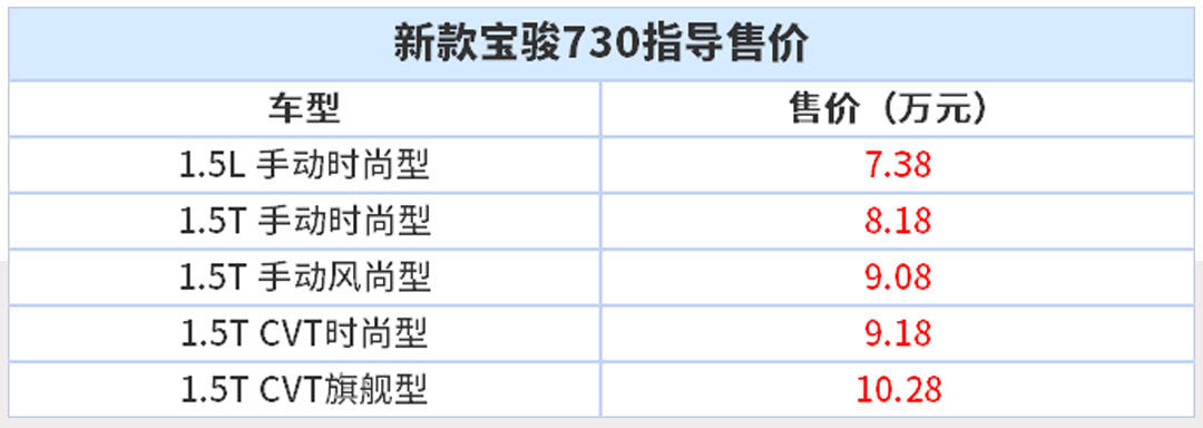 新款宝骏730于9月7日正式上市,共推出5款车型,售价7.38-10.28万元。