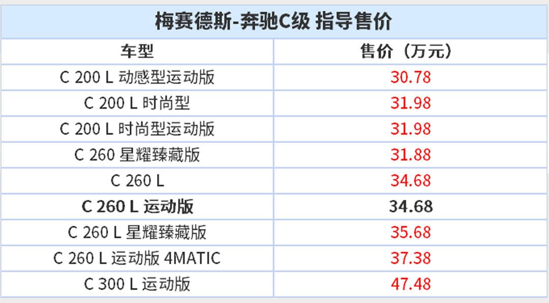 动力方面,新车继续搭载1.5T、1.5T+48V、2.0T三种动力,其中C 200车型最大功率为156马力,C 260车型最大功率为184马力,C 300车型最大功率为258马力;传动方面均匹配9速手自一体变速箱,另外C 260 L运动版还提供4MATIC四驱系统。